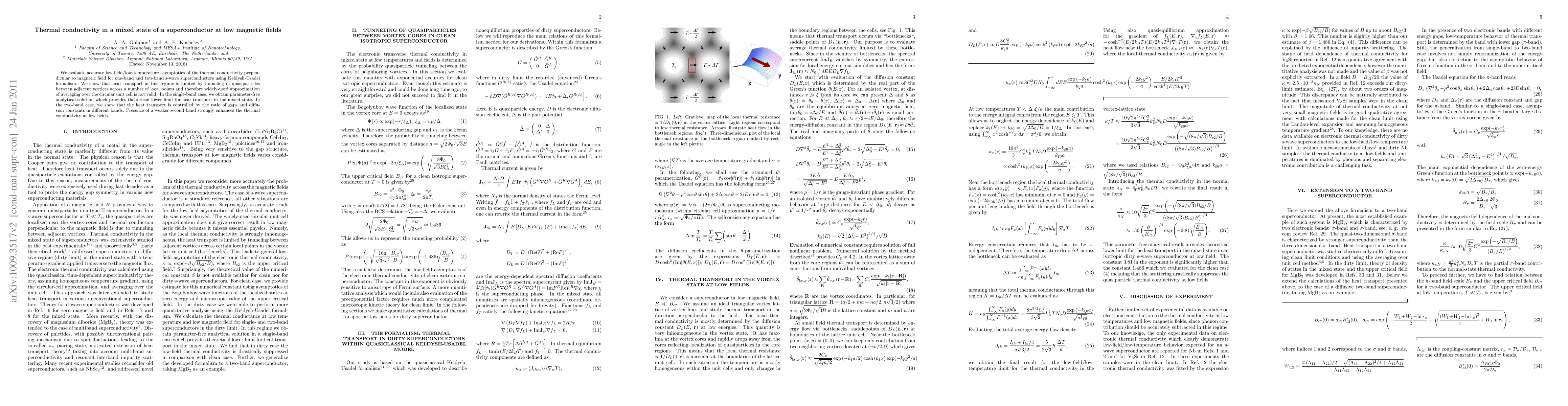 We evaluate accurate low-field/low-temperature asymptotics of the thermal conductivity perpendicular to magnetic field for one-band and two-band s-wave superconductors using Keldysh-Usadel formalism. We show that heat transport in this regime is limited by tunneling of quasiparticles between adjacent vortices across a number of local points and therefore widely-used approximation of averaging over circular unit cell is not valid. In the single-band case, we obtain parameter-free analytical solution which provides theoretical lower limit for heat transport in the mixed state. In the two-band case, we show that heat transport is controlled by the ratio of gaps and diffusion constants in different bands. Presence of a weaker second band strongly enhances the thermal conductivity at low fields