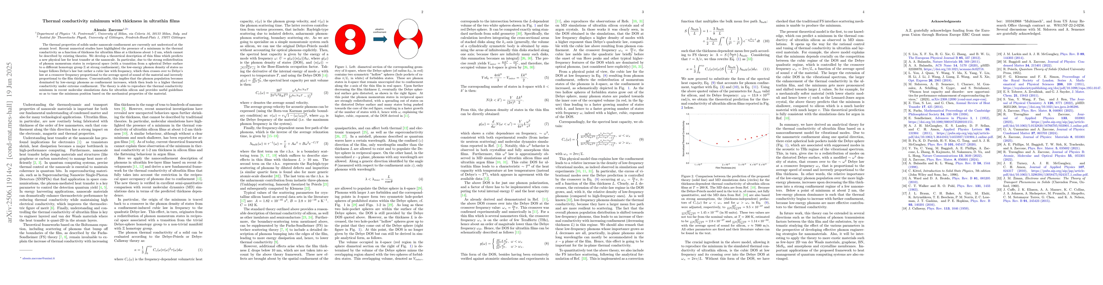 The thermal properties of solids under nanoscale confinement are currently not understood at the atomic level. Recent numerical studies have highlighted the presence of a minimum in the thermal conductivity as a function of thickness for ultrathin films at a thickness about 1-2 nm, which cannot be described by existing theories. We develop a theoretical description of thin films which predicts a new physical law for heat transfer at the nanoscale. In particular, due to the strong redistribution of phonon momentum states in reciprocal space (with a transition from a spherical Debye surface to a different homotopy group $\mathbb{Z}$ at strong confinement), the low-energy phonon density of states no longer follows Debye's law but rather a cubic law with frequency, which then crosses over to Debye's law at a crossover frequency proportional to the average speed of sound of the material and inversely proportional to the film thickness. Concomitantly, this implies that the phonon population becomes dominated by low-energy phonons as confinement increases, which then leads to a higher thermal conductivity under extreme confinement. The theory is able to reproduce the thermal conductivity minimum in recent molecular simulations data for ultrathin silicon and provides useful guidelines as to tune the minimum position based on the mechanical properties of the material.