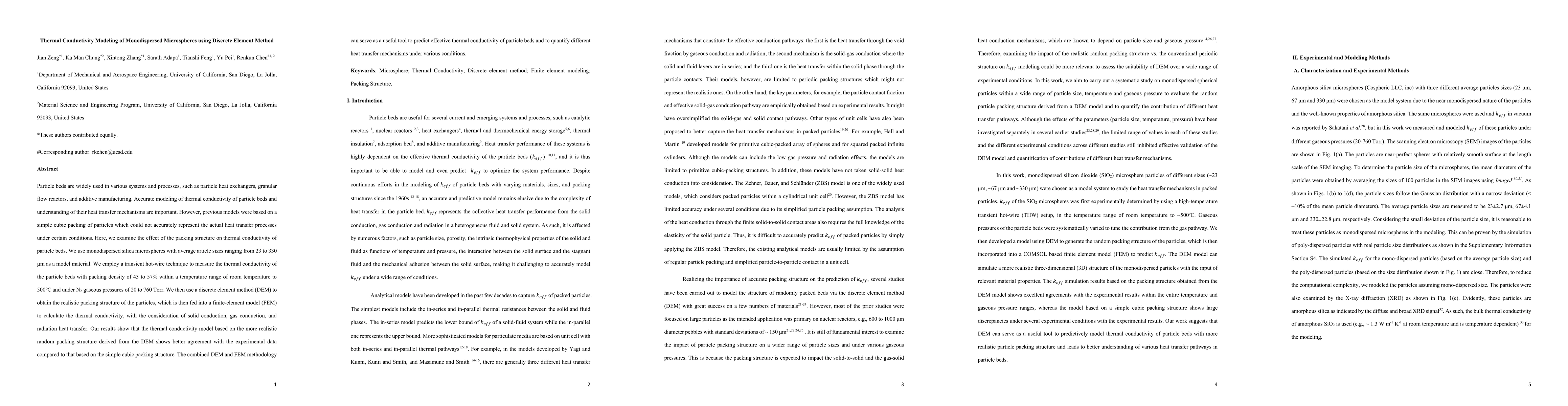 This paper models the thermal conductivity of monodispersed silica microspheres using a discrete element method (DEM) to capture realistic packing structures, which are then used in a finite-element model (FEM) to calculate thermal conductivity. The study finds that the DEM-FEM model provides better agreement with experimental data compared to traditional cubic packing models, highlighting the importance of realistic packing structures in thermal conductivity predictions.