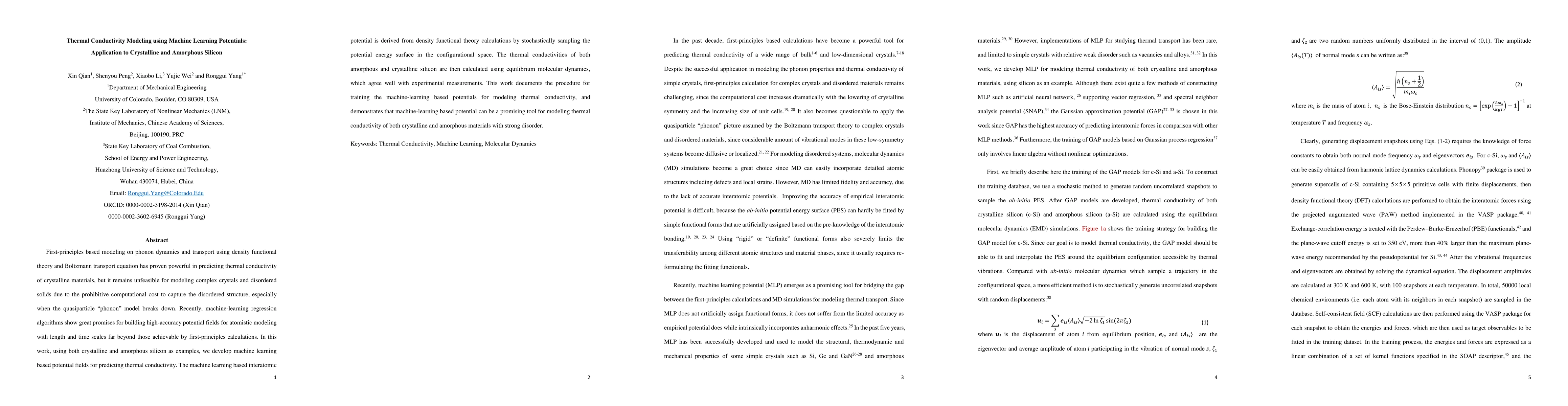 This research develops machine learning potentials derived from density functional theory to predict thermal conductivity in both crystalline and amorphous silicon, demonstrating that these potentials can model complex and disordered materials effectively, bypassing the computational limits of traditional first-principles methods. The trained potentials show good agreement with experimental thermal conductivities.
