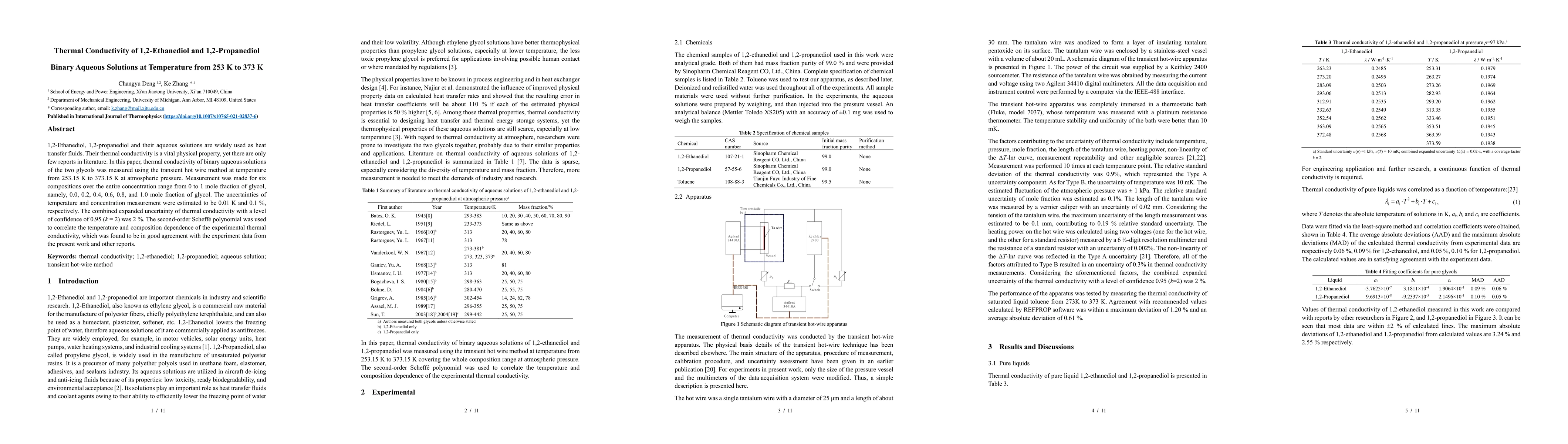 Researchers measured thermal conductivity of 1,2-ethanediol and 1,2-propanediol in binary aqueous solutions from 253K to 373K, finding a second-order polynomial correlation that matches experimental data and existing reports.