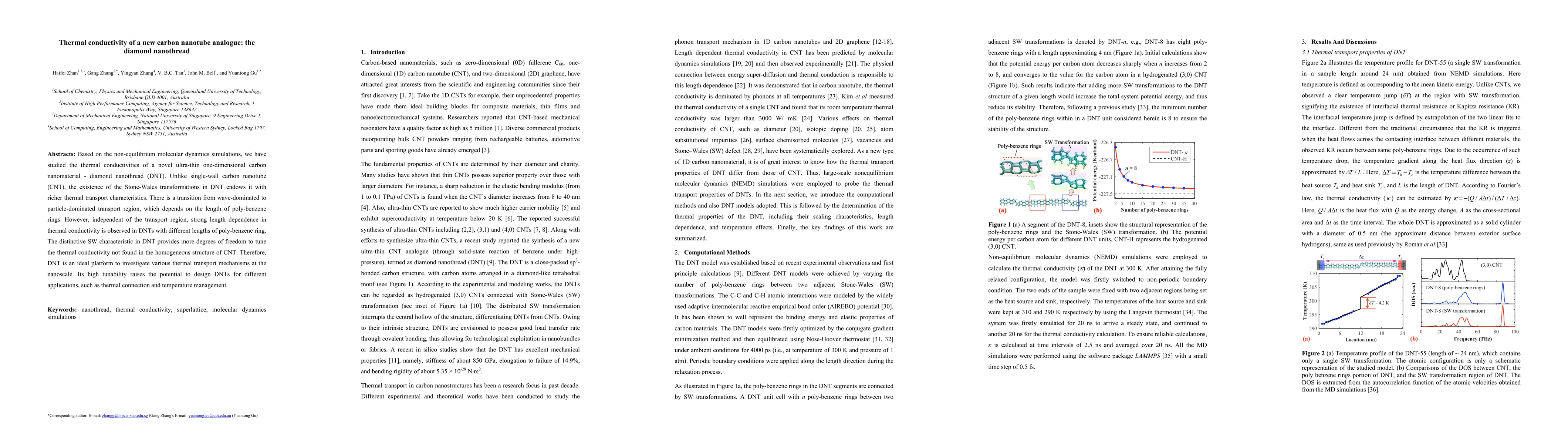 This study investigates the thermal conductivity of diamond nanothreads (DNT) using non-equilibrium molecular dynamics simulations, revealing a transition in thermal transport mechanisms influenced by the length of poly-benzene rings. The unique Stone-Wales transformations in DNTs offer high tunability for thermal conductivity, making them promising for applications in thermal management.