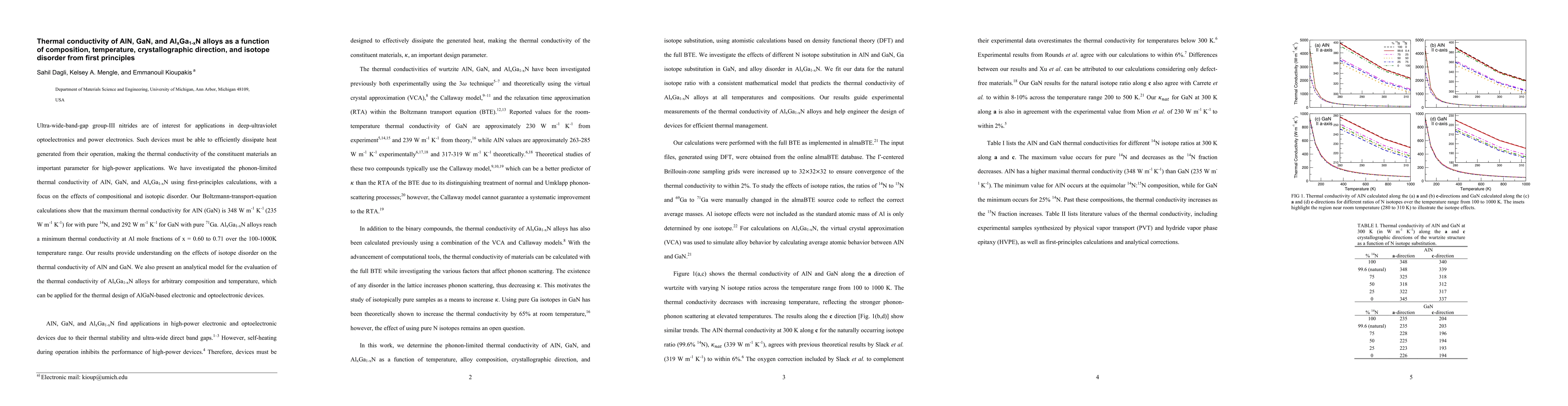 This study investigates the phonon-limited thermal conductivity of AlN, GaN, and Al$_x$Ga$_{1-x}$N using first-principles calculations, revealing that AlN has a maximum thermal conductivity of 348 W m$^{-1}$ K$^{-1}$ and GaN 235 W m$^{-1}$ K$^{-1}$, with a minimum in Al$_x$Ga$_{1-x}$N alloys at x = 0.60-0.71. The research also introduces an analytical model for predicting thermal conductivity in Al$_x$Ga$_{1-x}$N alloys for various compositions and temperatures.