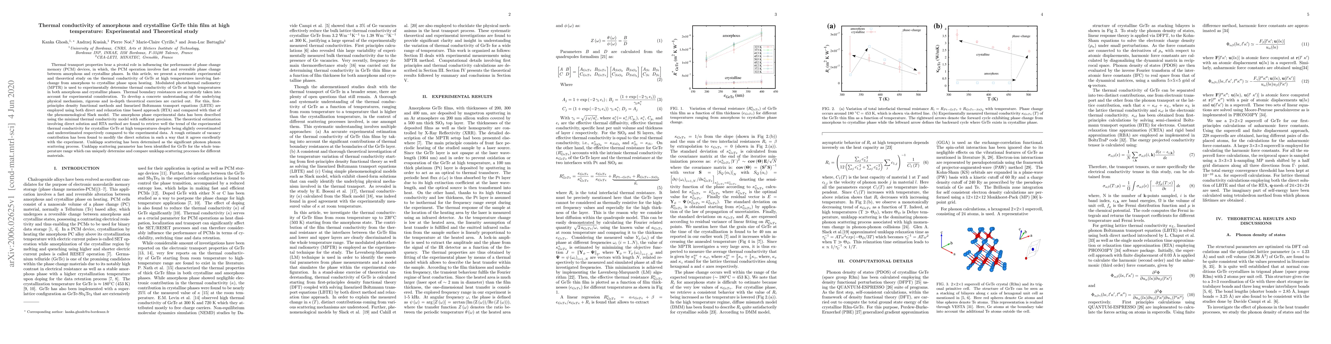 This paper experimentally and theoretically investigates the thermal conductivity of amorphous and crystalline GeTe thin films at high temperatures, using modulated photothermal radiometry and first-principles density functional methods. Theoretical models show good agreement with experimental data when accounting for vacancy contributions and identifying umklapp scattering as a significant phonon-phonon interaction process.