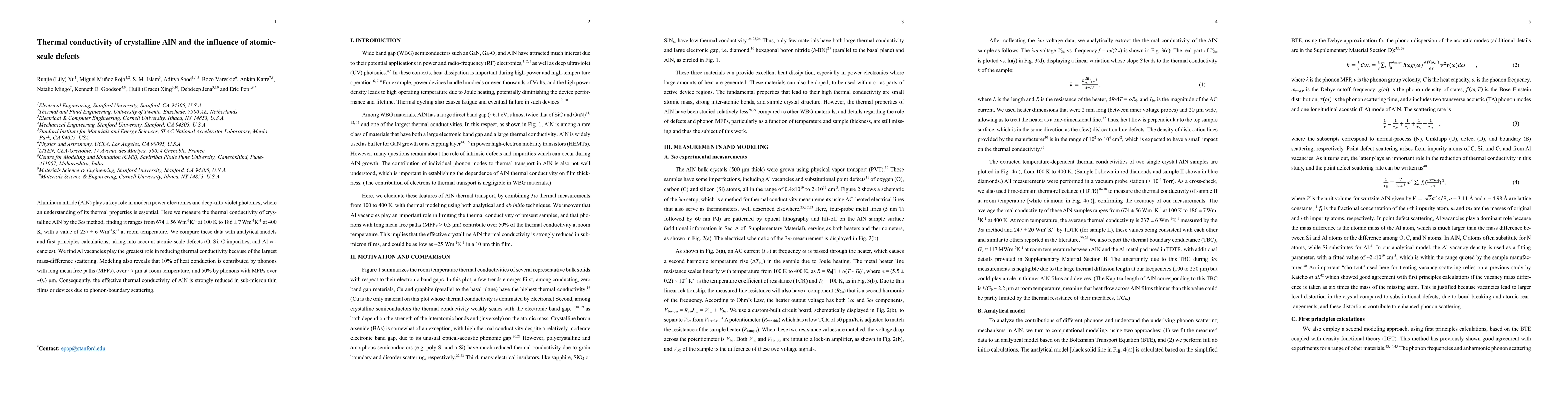 This study measures the thermal conductivity of crystalline AlN using the 3ω method, finding it ranges from 674 W/m/K at 100 K to 186 W/m/K at 400 K. Al vacancies are identified as the primary factor reducing thermal conductivity due to significant mass-difference scattering, while phonons with long mean free paths contribute 10% of heat conduction.