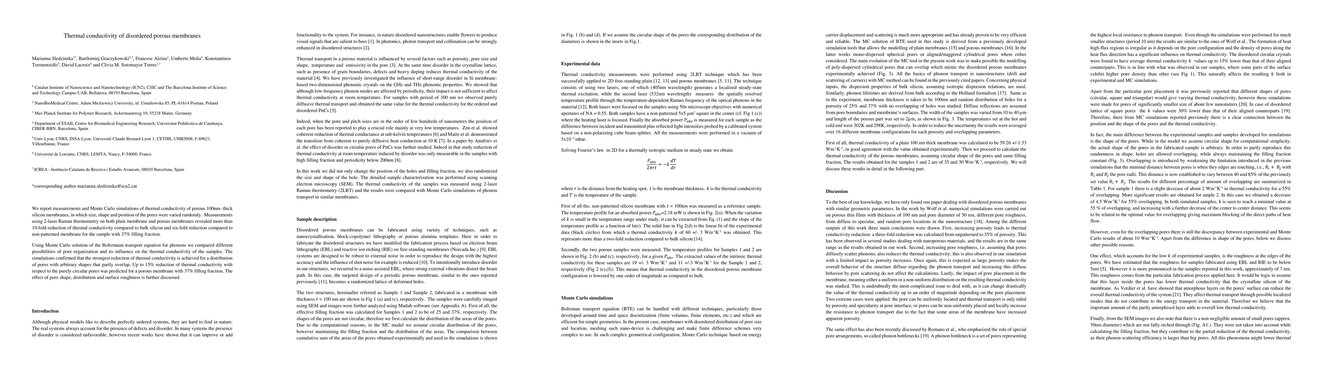 This paper measures and simulates thermal conductivity in disordered porous silicon membranes, finding a significant reduction due to random pore distribution and shape. Monte Carlo simulations confirm that overlapping, irregular pore distributions provide the greatest thermal conductivity reduction.