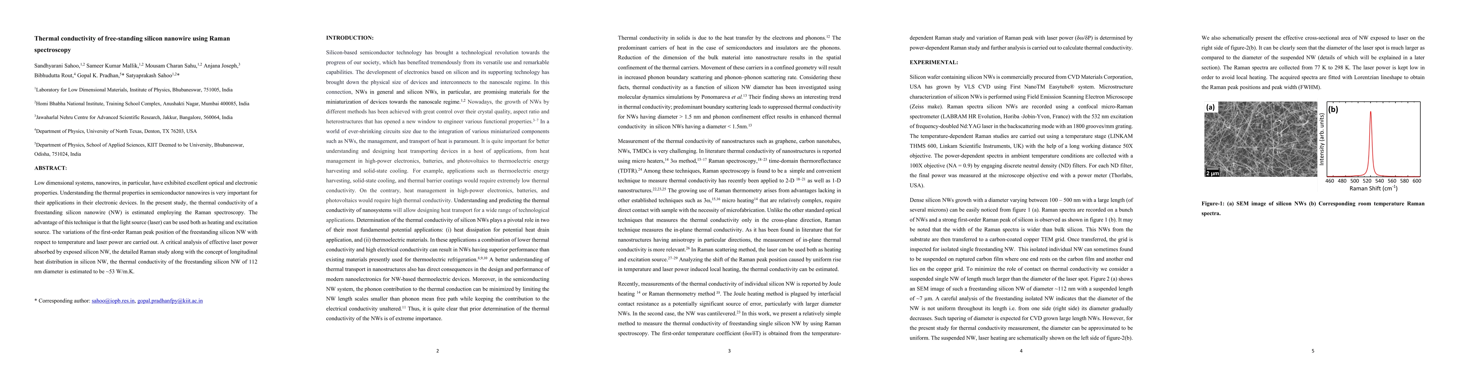 The paper presents a method for estimating thermal conductivity using Raman spectroscopy in free-standing silicon NWs, considering both temperature and laser power dependencies.