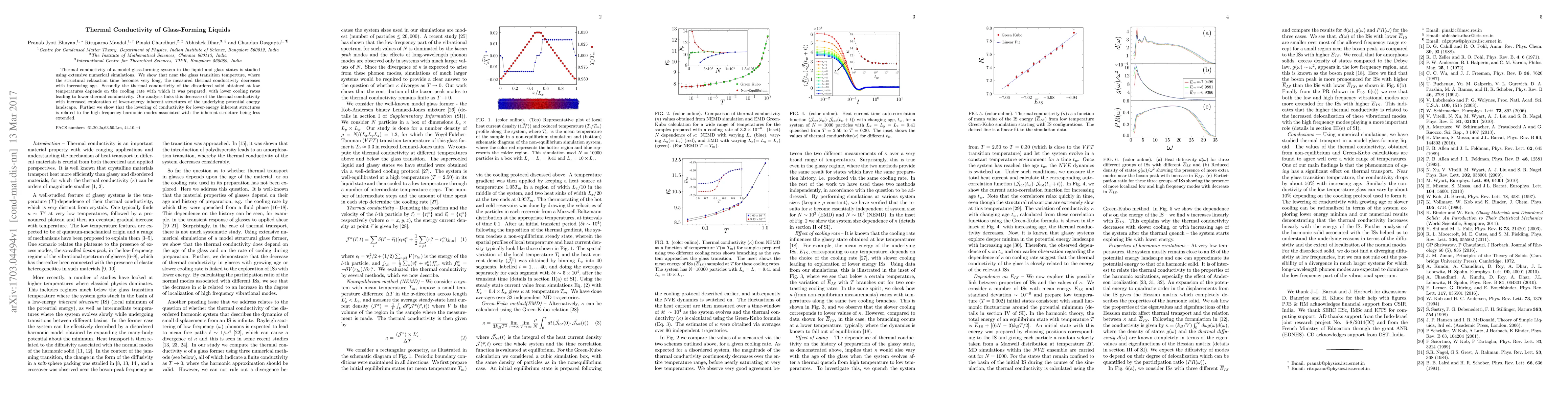 This study uses numerical simulations to investigate thermal conductivity in glass-forming liquids and solids, revealing a decrease in thermal conductivity near the glass transition due to longer structural relaxation times and increased exploration of lower-energy inherent structures. Lower cooling rates during solidification also lead to lower thermal conductivity, linked to less extended high-frequency harmonic modes.