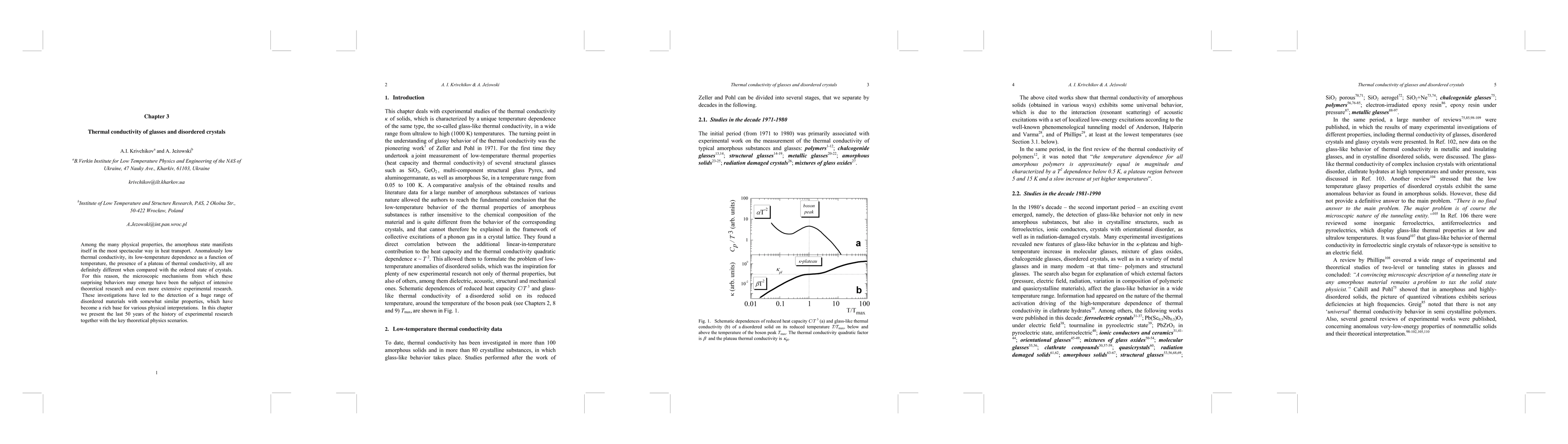 Among the many physical properties, the amorphous state manifests itself in the most spectacular way in heat transport. Anomalously low thermal conductivity, its low-temperature dependence as a function of temperature, the presence of a plateau of thermal conductivity, all are definitely different when compared with the ordered state of crystals. For this reason, the microscopic mechanisms from which these surprising behaviors may emerge have been the subject of intensive theoretical research and even more extensive experimental research. These investigations have led to the detection of a huge range of disordered materials with somewhat similar properties, which have become a rich base for various physical interpretations. In this chapter we present the last 50 years of the history of experimental research together with the key theoretical physics scenarios
