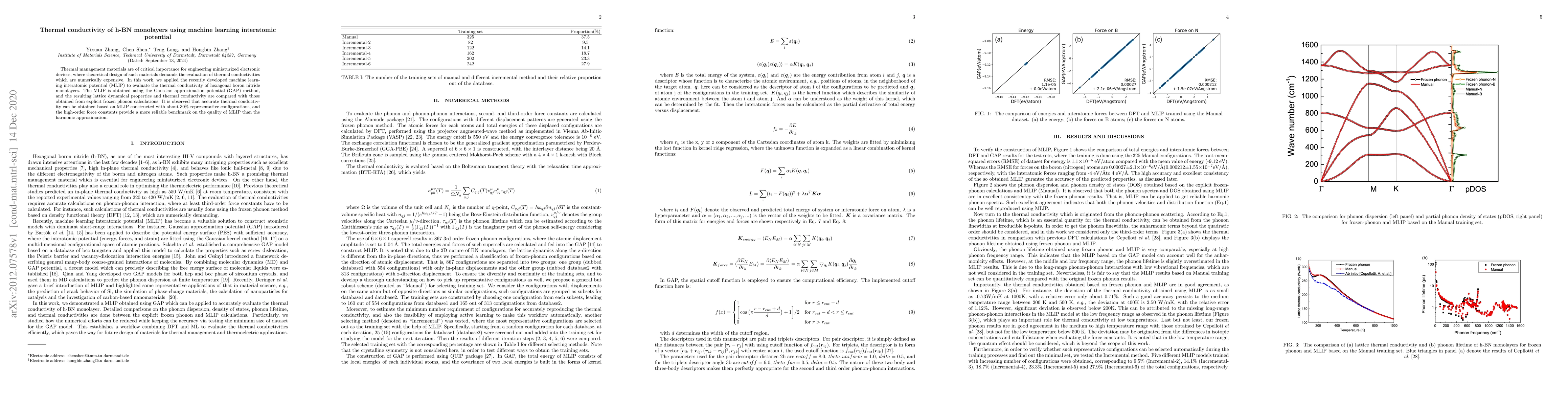 This study employs machine learning interatomic potentials (MLIP) derived from the Gaussian approximation potential (GAP) method to evaluate the thermal conductivity of hexagonal boron nitride monolayers, demonstrating accurate results with only 30% representative configurations compared to traditional phonon calculations. The high-order force constants in MLIP provide a more reliable benchmark than the harmonic approximation.