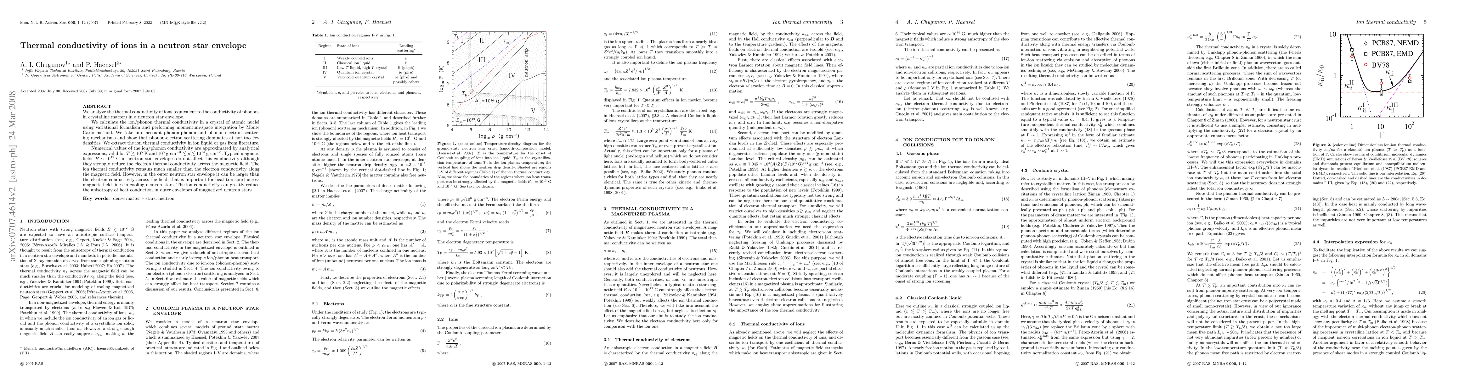 We analyze the thermal conductivity of ions (equivalent to the conductivity of phonons in crystalline matter) in a neutron star envelope. We calculate the ion/phonon thermal conductivity in a crystal of atomic nuclei using variational formalism and performing momentum-space integration by Monte Carlo method. We take into account phonon-phonon and phonon-electron scattering mechanisms and show that phonon-electron scattering dominates at not too low densities. We extract the ion thermal conductivity in ion liquid or gas from literature. Numerical values of the ion/phonon conductivity are approximated by analytical expressions, valid for T>10^5 K and 10^5 g cm^-3 < \rho < 10^14 g cm^-3. Typical magnetic fields B~10^12 G in neutron star envelopes do not affect this conductivity although they strongly reduce the electron thermal conductivity across the magnetic field. The ion thermal conductivity remains much smaller than the electron conductivity along the magnetic field. However, in the outer neutron star envelope it can be larger than the electron conductivity across the field, that is important for heat transport across magnetic field lines in cooling neutron stars. The ion conductivity can greatly reduce the anisotropy of heat conduction in outer envelopes of magnetized neutron stars.