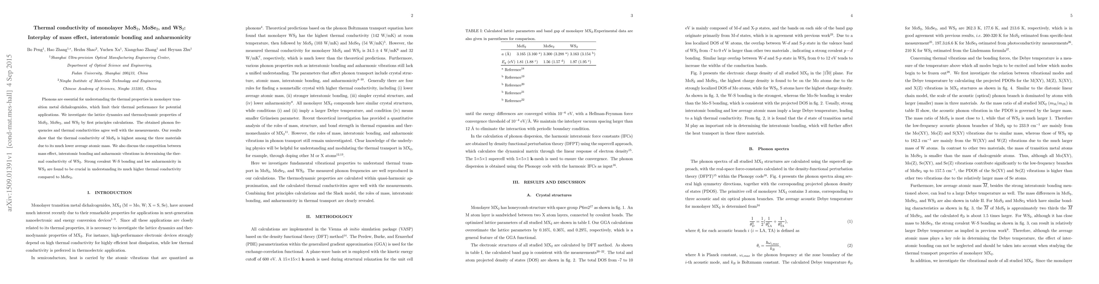 This paper investigates the thermal conductivity of monolayer MoS2, MoSe2, and WS2 using first principles calculations, finding that MoS2 has the highest thermal conductivity due to its lower average atomic mass. The study highlights the importance of mass effect, interatomic bonding, and anharmonic vibrations, particularly noting that strong covalent W-S bonds and low anharmonicity enhance the thermal conductivity of WS2 compared to MoSe2.