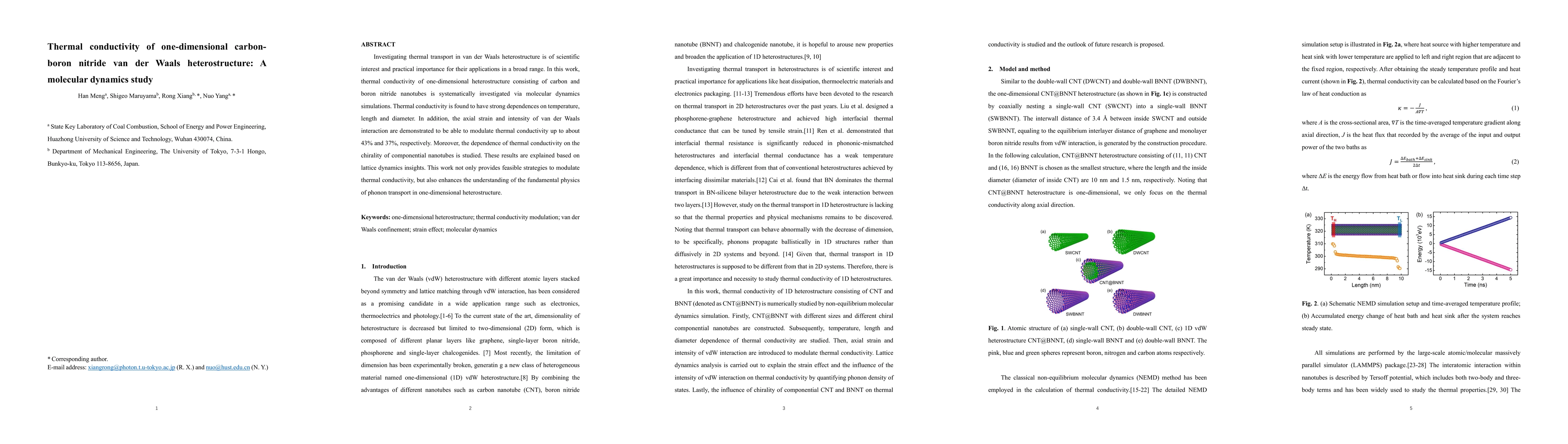 This study investigates the thermal conductivity of a one-dimensional van der Waals heterostructure made of carbon and boron nitride nanotubes using molecular dynamics simulations. The research finds that thermal conductivity is significantly affected by temperature, structure length, diameter, axial strain, and van der Waals interactions, providing insights into phonon transport and strategies to modulate thermal conductivity.