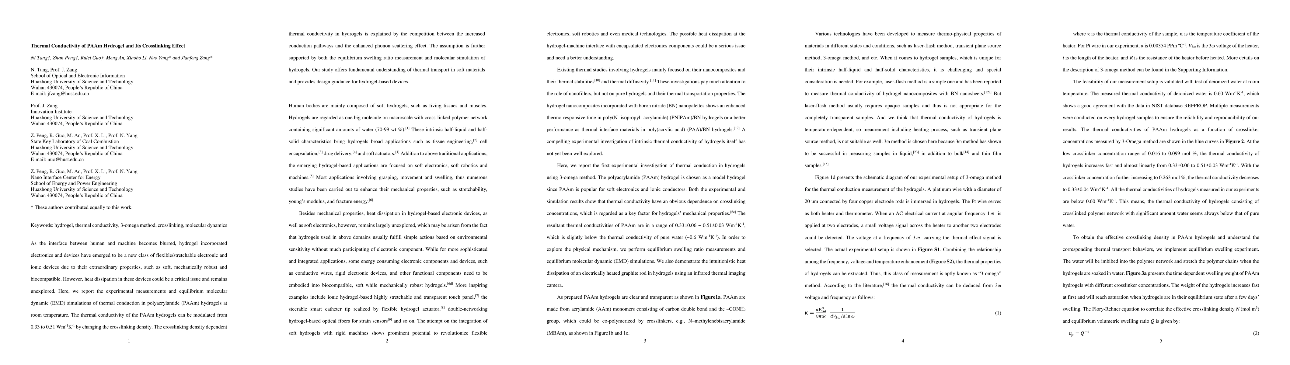 This study investigates the thermal conductivity of polyacrylamide (PAAm) hydrogels, finding that it ranges from 0.33 to 0.51 Wm⁻¹K⁻¹, which can be modulated by altering the crosslinking density. The research combines experimental measurements and molecular simulations to explain the effects of crosslinking on thermal conduction.