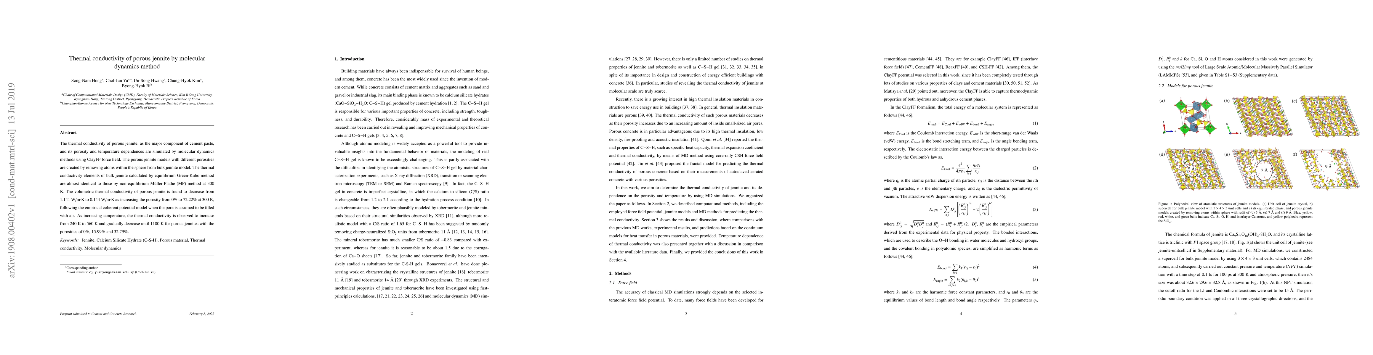 This study uses molecular dynamics simulations to investigate the thermal conductivity of porous jennite, a key component of cement paste, finding that it decreases with increasing porosity and follows an empirical model. The thermal conductivity increases with temperature up to 560 K before decreasing at higher temperatures.