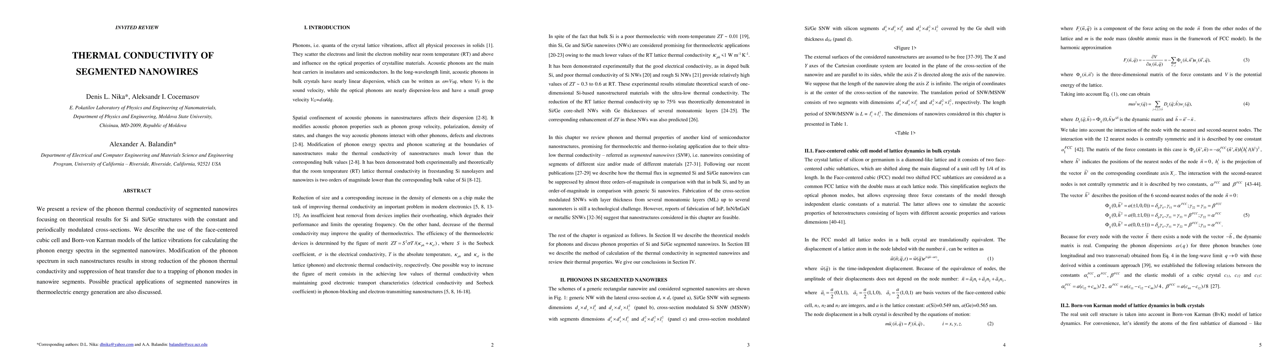 This paper reviews the phonon thermal conductivity in segmented nanowires, particularly Si and Si/Ge structures with varying cross-sections, using lattice vibration models. It highlights significant reductions in thermal conductivity due to phonon trapping, with potential thermoelectric applications.