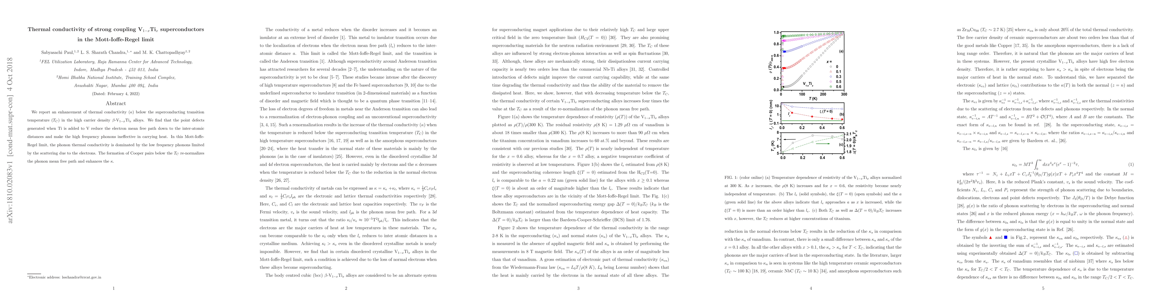 The study finds an unusual increase in thermal conductivity (κ) below the superconducting temperature (T_C) in high-density β-V1-xTix alloys. This phenomenon is attributed to Ti-induced point defects reducing electron mean free paths to inter-atomic distances, rendering high-frequency phonons ineffective at heat conduction. In the Mott-Ioffe-Regel limit, low-frequency phonons, scattered by electrons, dominate κ. Cooper pair formation below T_C normalizes phonon mean free paths, boosting κ.