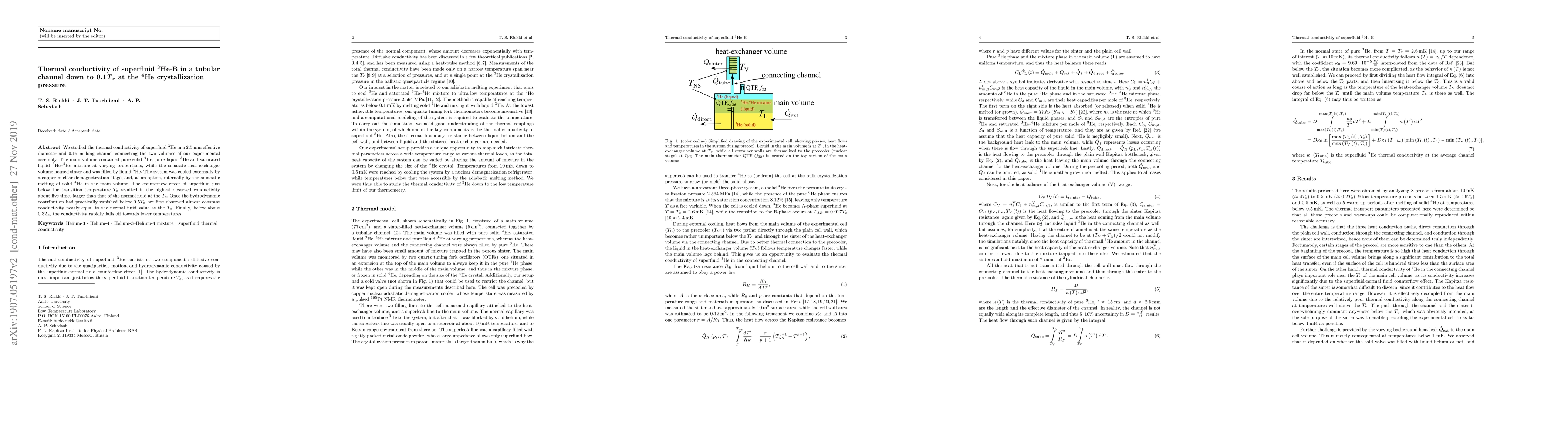 We studied the thermal conductivity of superfluid $^3$He in a 2.5 mm effective diameter and 0.15 m long channel connecting the two volumes of our experimental assembly. The main volume contained pure solid $^4$He, pure liquid $^3$He and saturated liquid $^3$He-$^4$He mixture at varying proportions, while the separate heat-exchanger volume housed sinter and was filled by liquid $^3$He. The system was cooled externally by a copper nuclear demagnetization stage, and, as an option, internally by the adiabatic melting of solid $^4$He in the main volume. The counterflow effect of superfluid just below the transition temperature $T_c$ resulted in the highest observed conductivity about five times larger than that of the normal fluid at the $T_c$. Once the hydrodynamic contribution had practically vanished below $0.5T_c$, we first observed almost constant conductivity nearly equal to the normal fluid value at the $T_c$. Finally, below about $0.3T_c$, the conductivity rapidly falls off towards lower temperatures.