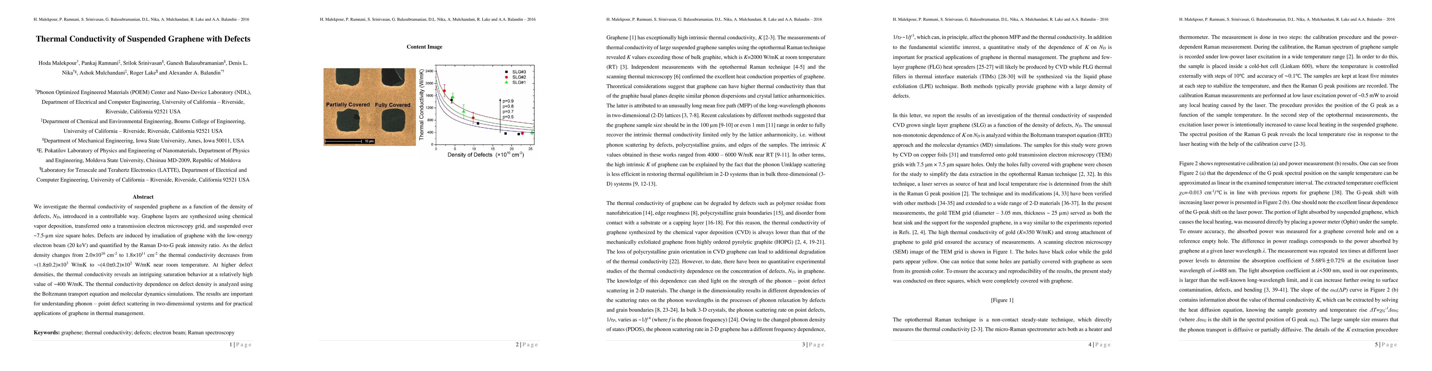This study examines how defect density impacts the thermal conductivity of suspended graphene, finding that it decreases significantly with increasing defects but saturates at high densities, providing insights into phonon scattering in 2D materials. The findings are vital for applications in thermal management using graphene.