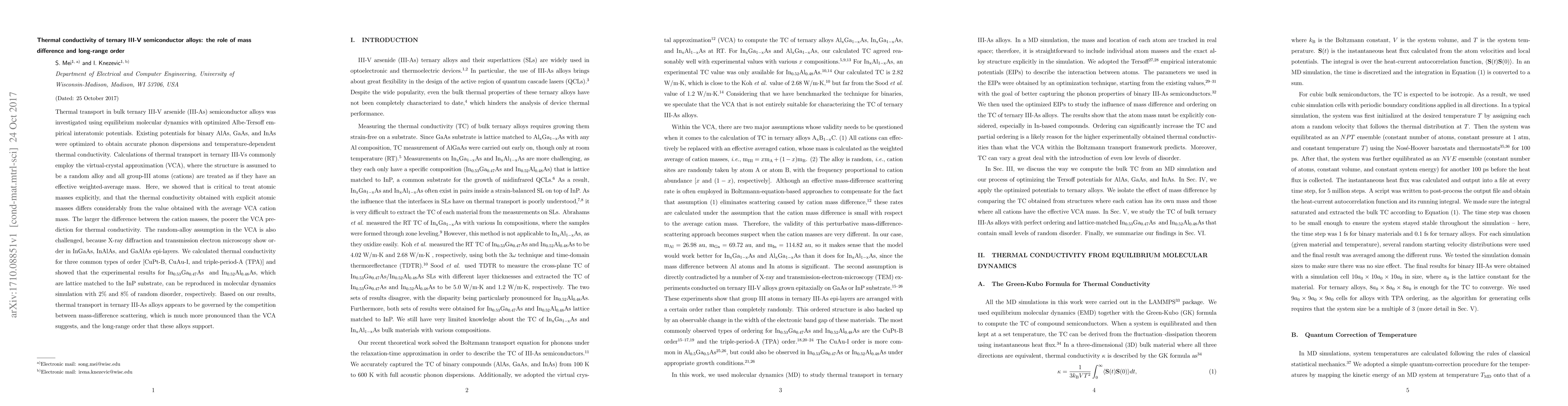 Thermal transport in bulk ternary III-V arsenide (III-As) semiconductor alloys was investigated using equilibrium molecular dynamics with optimized Albe-Tersoff empirical interatomic potentials. Existing potentials for binary AlAs, GaAs, and InAs were optimized to obtain accurate phonon dispersions and temperature-dependent thermal conductivity. Calculations of thermal transport in ternary III-Vs commonly employ the virtual-crystal approximation (VCA), where the structure is assumed to be a random alloy and all group-III atoms (cations) are treated as if they have an effective weighted-average mass. Here, we showed that is critical to treat atomic masses explicitly, and that the thermal conductivity obtained with explicit atomic masses differs considerably from the value obtained with the average VCA cation mass. The larger the difference between the cation masses, the poorer the VCA prediction for thermal conductivity. The random-alloy assumption in the VCA is also challenged, because X-ray diffraction and transmission electron microscopy show order in InGaAs, InAlAs, and GaAlAs epi-layers. We calculated thermal conductivity for three common types of order [CuPt-B, CuAu-I, and triple-period-A (TPA)] and showed that the experimental results for In$_{0.53}$Ga$_{0.47}$As and In$_{0.52}$Al$_{0.48}$As, which are lattice matched to the InP substrate, can be reproduced in molecular dynamics simulation with 2% and 8% of random disorder, respectively. Based on our results, thermal transport in ternary III-As alloys appears to be governed by the competition between mass-difference scattering, which is much more pronounced than the VCA suggests, and the long-range order that these alloys support.