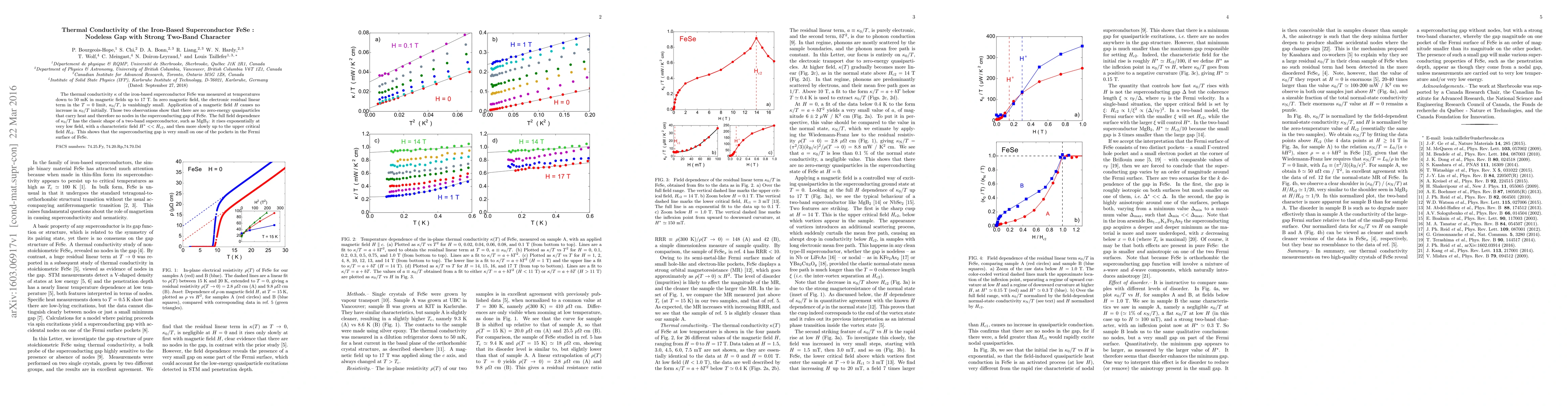 This study reveals that iron-based superconductor FeSe exhibits a nodeless superconducting gap and a strong two-band character, evidenced by vanishingly small thermal conductivity at zero magnetic field and an exponential rise in thermal conductivity at low fields, similar to MgB2.