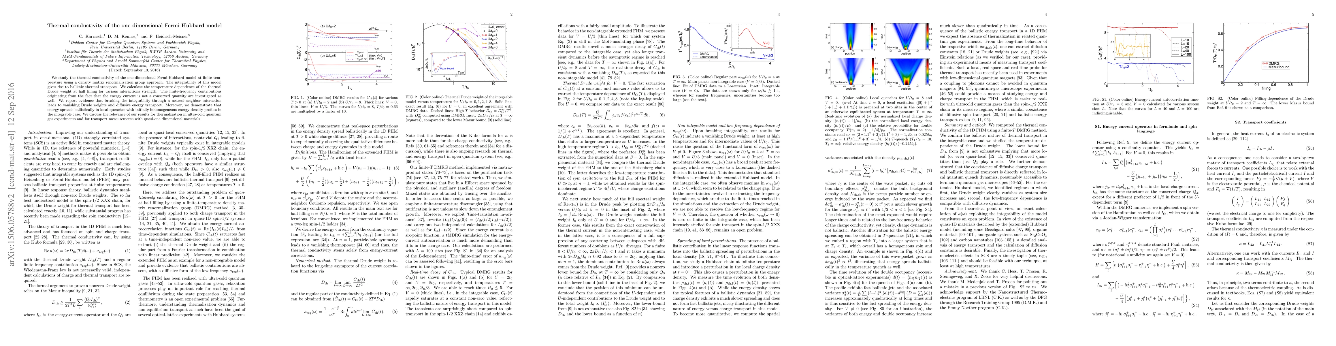 This paper investigates the thermal conductivity of the one-dimensional Fermi-Hubbard model using a density matrix renormalization group, finding ballistic transport in the integrable case. It reports that breaking integrability leads to vanishing Drude weights and diffusive transport, relevant for ultra-cold quantum gas experiments and quasi-one dimensional materials.