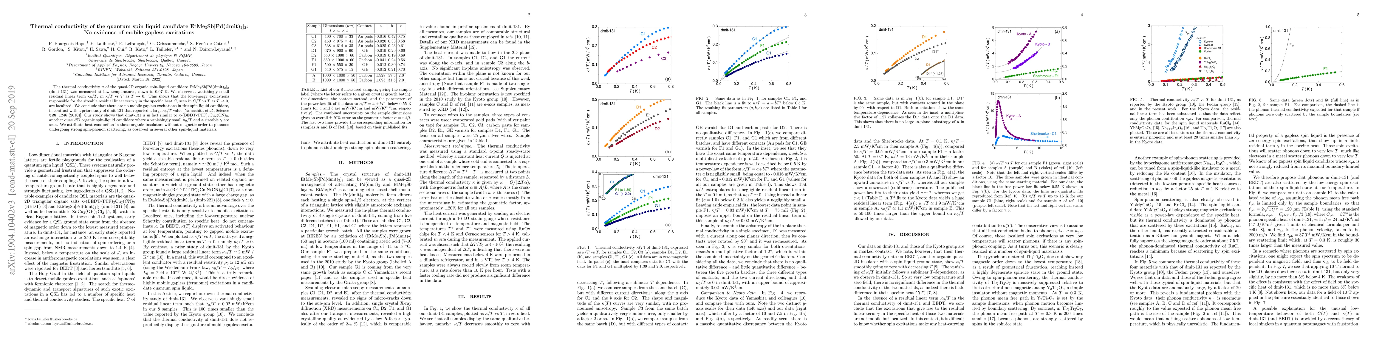 The paper presents detailed thermal conductivity measurements of dmit-131, challenging previous findings on mobile gapless excitations and attributing heat conduction to phonons scattered by low-energy spin excitations.
