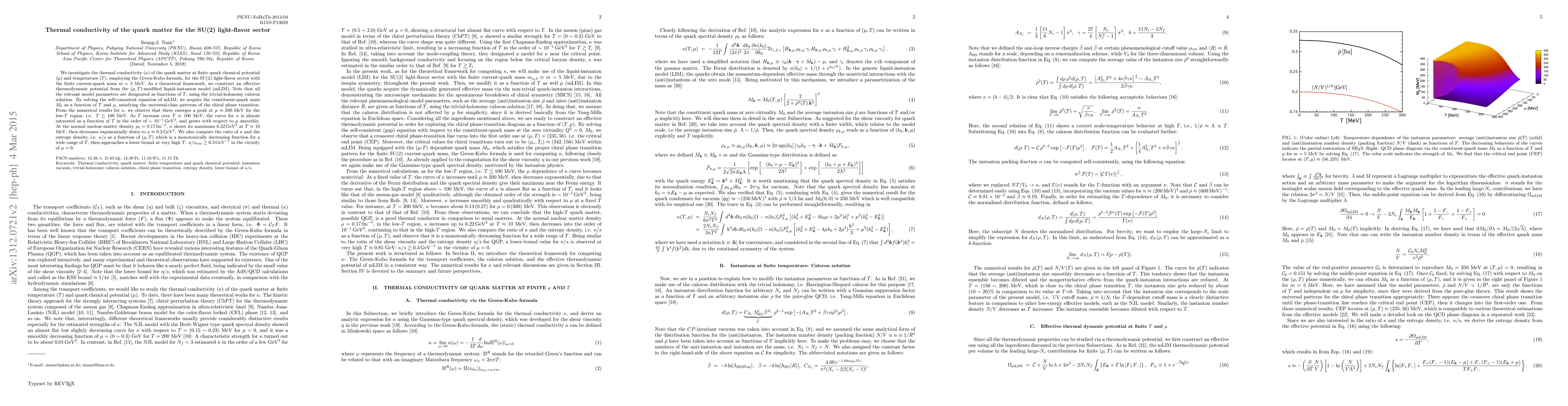 We investigate the thermal conductivity ($\kappa$) of the quark matter at finite quark chemical potential $(\mu)$ and temperature $(T)$, employing the Green-Kubo formula, for the SU(2) light-flavor sector with the finite current-quark mass $m=5$ MeV. As a theoretical framework, we construct an effective thermodynamic potential from the $(\mu,T)$-modified liquid-instanton model (mLIM). Note that all the relevant model parameters are designated as functions of $T$, using the trivial-holonomy caloron solution. By solving the self-consistent equation of mLIM, we acquire the constituent-quark mass $M_0$ as a function of $T$ and $\mu$, satisfying the universal-class patterns of the chiral phase transition. From the numerical results for $\kappa$, we observe that there emerges a peak at $\mu\approx200$ MeV for the low-$T$ region, i.e. $T\lesssim100$ MeV. As $T$ increase over $T\approx100$ MeV, the curve for $\kappa$ is almost saturated as a function of $T$ in the order of $\sim10^{-1}\,\mathrm{GeV}^2$, and grows with respect to $\mu$ smoothly. At the normal nuclear-matter density $\rho_0=0.17\,\mathrm{fm}^{-3}$, $\kappa$ shows its maximum $6.22\,\mathrm{GeV}^2$ at $T\approx10$ MeV, then decreases exponentially down to $\kappa\approx0.2\,\mathrm{GeV}^2$. We also compute the ratio of $\kappa$ and the entropy density, i.e. $\kappa/s$ as a function of $(\mu,T)$ which is a monotonically decreasing function for a wide range of $T$, then approaches a lower bound at very high $T$: $\kappa/s_\mathrm{min}\gtrsim0.3\,\mathrm{GeV}^{-1}$ in the vicinity of $\mu=0$.