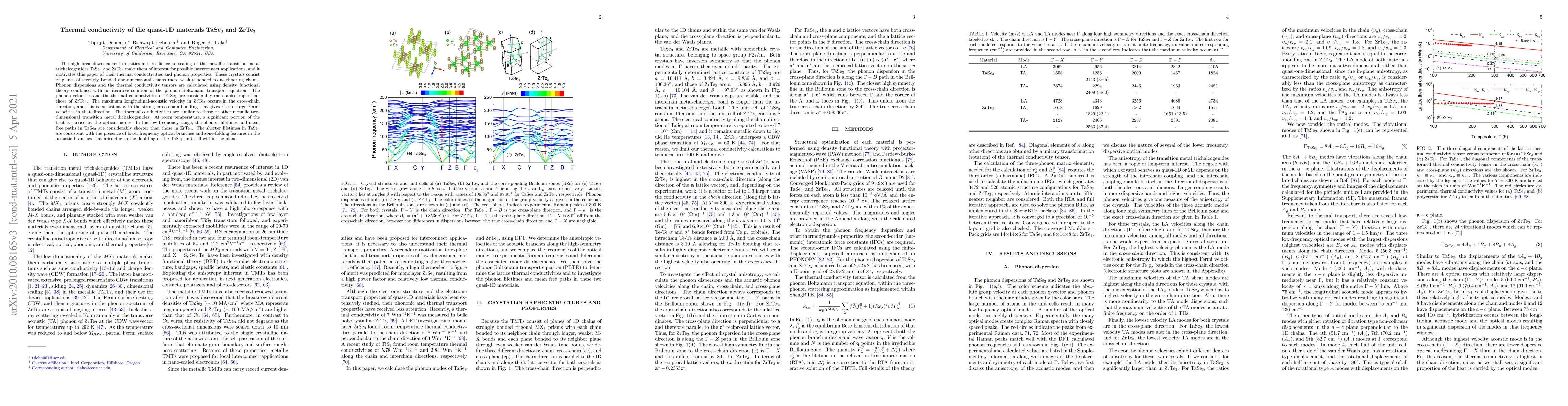 The high breakdown current densities and resilience to scaling of the metallic transition metal trichalcogenides TaSe3 and ZrTe3 make them of interest for possible interconnect applications, and it motivates this study of their thermal conductivities and phonon properties. These crystals consist of planes of strongly bonded one-dimensional chains more weakly bonded to neighboring chains. Phonon dispersions and the thermal conductivity tensors are calculated using density functional theory combined with an iterative solution of the phonon Boltzmann transport equation. The phonon velocities and the thermal conductivities of TaSe3 are considerably more anisotropic than those of ZrTe3. The maximum LA velocity in ZrTe3 occurs in the cross-chain direction, and this is consistent with the strong cross-chain bonding that gives rise to large Fermi velocities in that direction. The thermal conductivities are similar to those of other metallic two-dimensional transition metal dichalcogenides. At room temperature, a significant portion of the heat is carried by the optical modes. In the low frequency range, the phonon lifetimes and mean free paths in TaSe3 are considerably shorter than those in ZrTe3. The shorter lifetimes in TaSe3 are consistent with the presence of lower frequency optical branches and zone-folding features in the acoustic branches that arise due to the doubling of the TaSe3 unit cell within the plane.