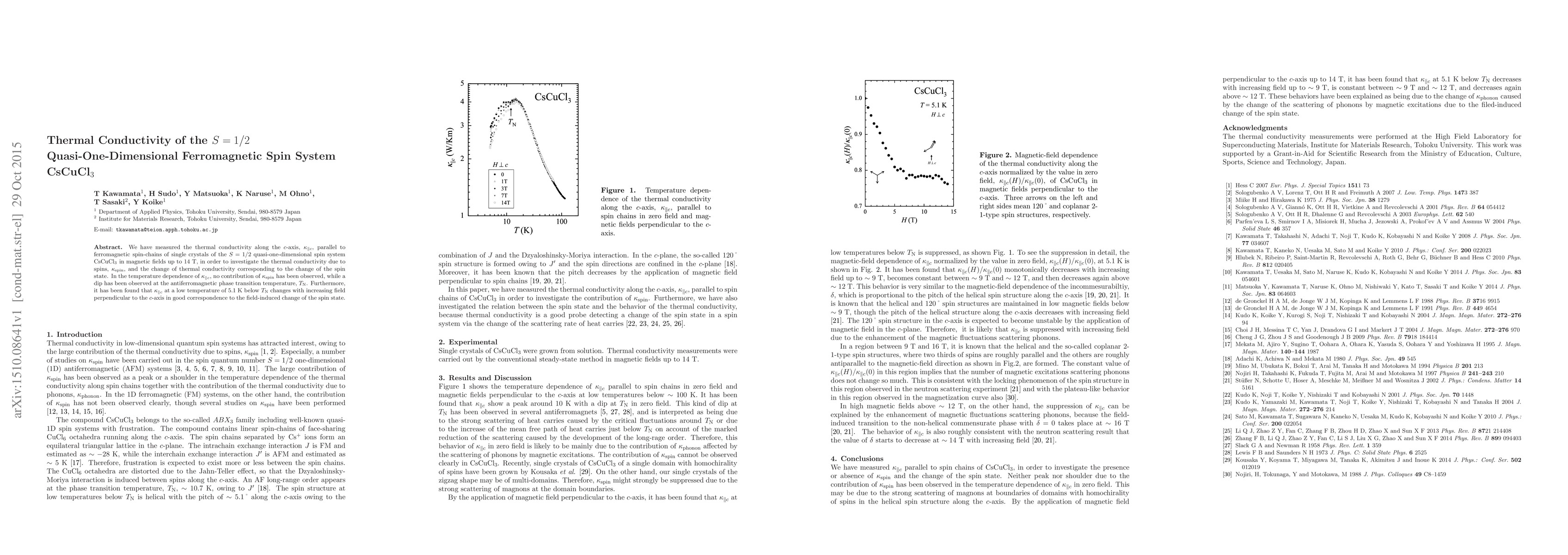 This study investigates the thermal conductivity along the c-axis of CsCuCl3, a quasi-one-dimensional ferromagnetic spin system, revealing no spin contribution to thermal conductivity but a dip at the antiferromagnetic transition temperature, TN. The thermal conductivity changes with magnetic field, correlating with spin state modifications.