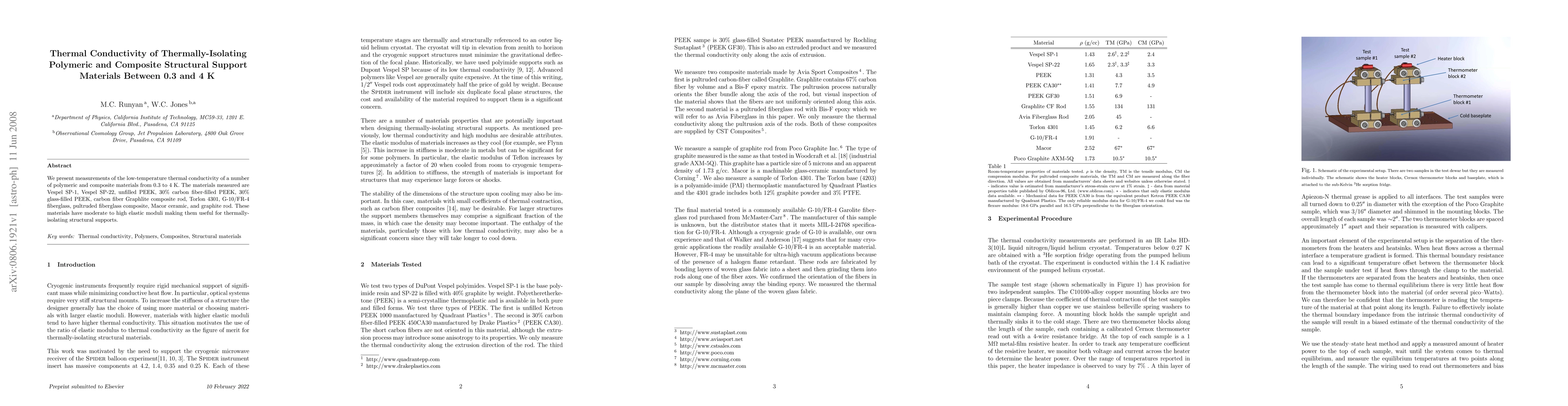 This study measures the low-temperature thermal conductivity of various thermally-isolating polymeric and composite materials, including Vespel, PEEK, fiberglass, Torlon, Macor, and graphite, finding significant differences in thermal conductivity due to material composition and structure. These materials are suitable for thermally-isolating structural supports in cryogenic applications.