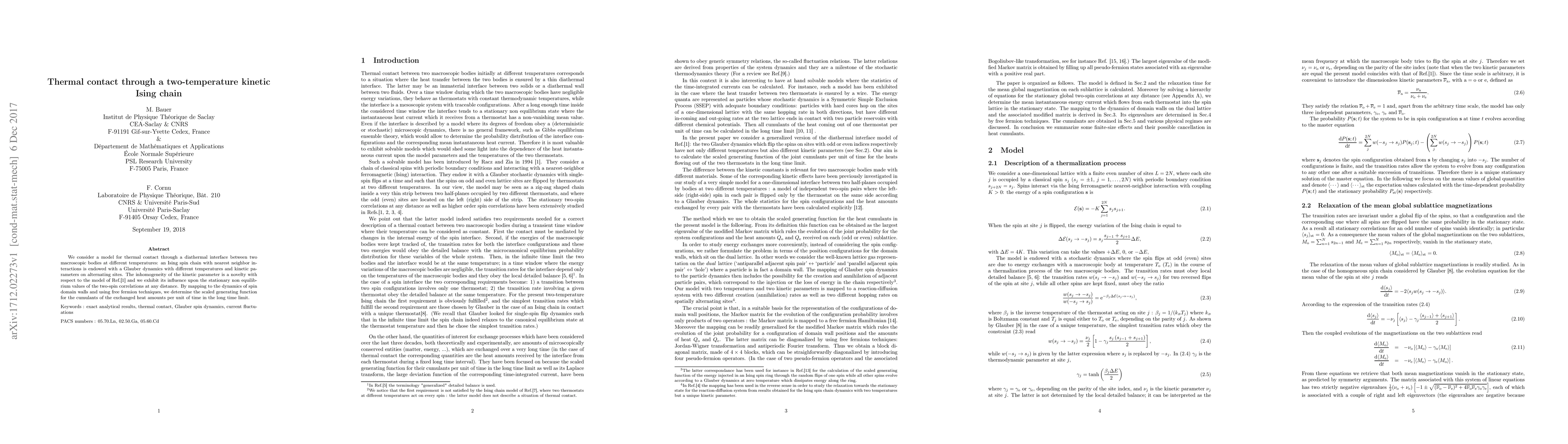 We consider a model for thermal contact through a diathermal interface between two macroscopic bodies at different temperatures: an Ising spin chain with nearest neighbor interactions is endowed with a Glauber dynamics with different temperatures and kinetic parameters on alternating sites. The inhomogeneity of the kinetic parameter is a novelty with respect to the model of Ref.[1] and we exhibit its influence upon the stationary non equilibrium values of the two-spin correlations at any distance. By mapping to the dynamics of spin domain walls and using free fermion techniques, we determine the scaled generating function for the cumulants of the exchanged heat amounts per unit of time in the long time limit.