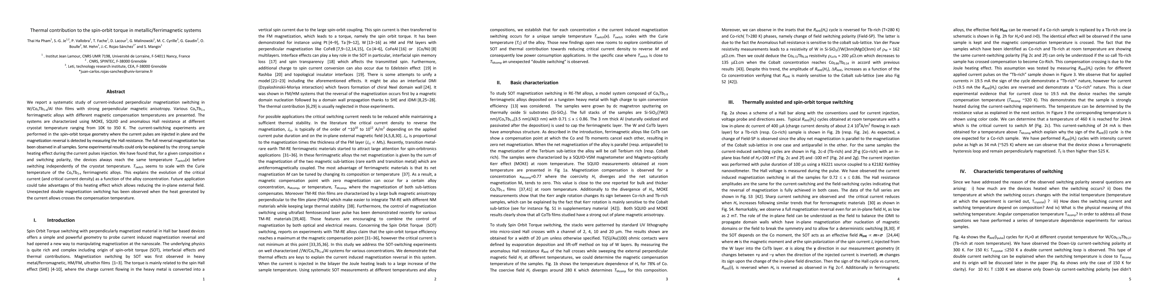 We report a systematic study of current-induced perpendicular magnetization switching in W/Co$_{x}$Tb$_{1-x}$/Al thin films with strong perpendicular magnetic anisotropy. Various Co$_{x}$Tb$_{1-x}$ ferrimagnetic alloys with different magnetic compensation temperatures are presented. The systems are characterized using MOKE, SQUID and anomalous Hall resistance at different cryostat temperature ranging from 10 K to 350 K. The current-switching experiments are performed in the spin-orbit torque geometry where the current pulses are injected in plane and the magnetization reversal is detected by measuring the Hall resistance. The full reversal magnetization has been observed in all samples. Some experimental results could only be explained by the strong sample heating effect during the current pulses injection. We have found that, for a given composition $x$ and switching polarity, the devices always reach the same temperature $\textit{T}_{switch}(x)$ before switching independently of the cryostat temperature. $\textit{T}_{switch}$ seems to scale with the Curie temperature of the Co$_{x}$Tb$_{1-x}$ ferrimagnetic alloys. This explains the evolution of the critical current (and critical current density) as a function of the alloy concentration. Future application could take advantages of this heating effect which allows reducing the in-plane external field. Unexpected double magnetization switching has been observed when the heat generated by the current allows crosses the compensation temperature.