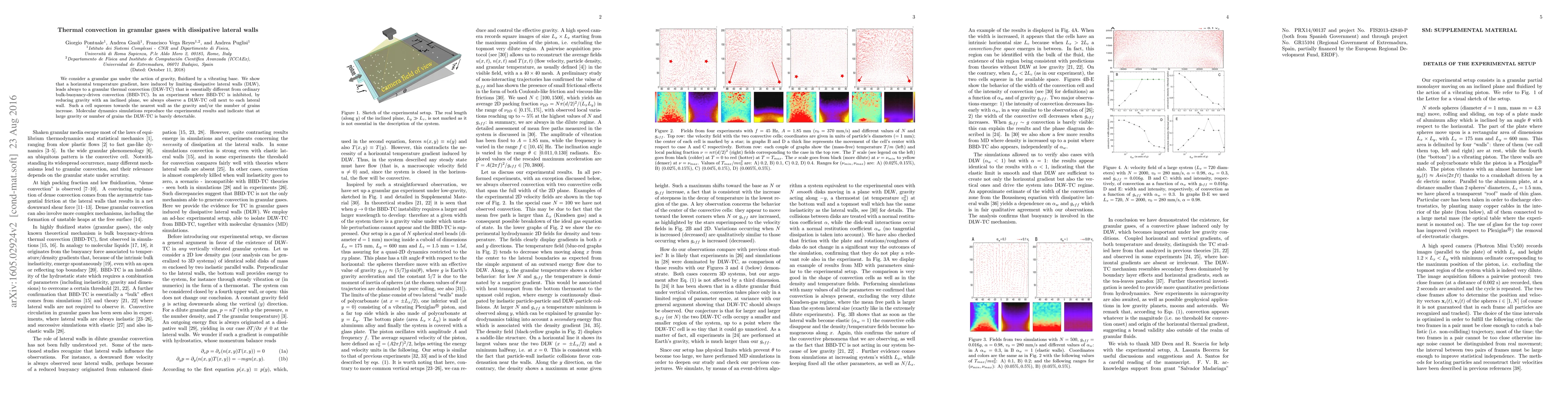This study investigates granular thermal convection in a gas under gravity, driven by dissipative lateral walls, revealing a distinct convection pattern (DLW-TC) compared to buoyancy-driven convection (BD-TC). Experimental and simulation results show that DLW-TC cells form near walls, squeezing towards them with increased gravity or grain number, and are barely detectable under strong gravitational or high grain conditions.