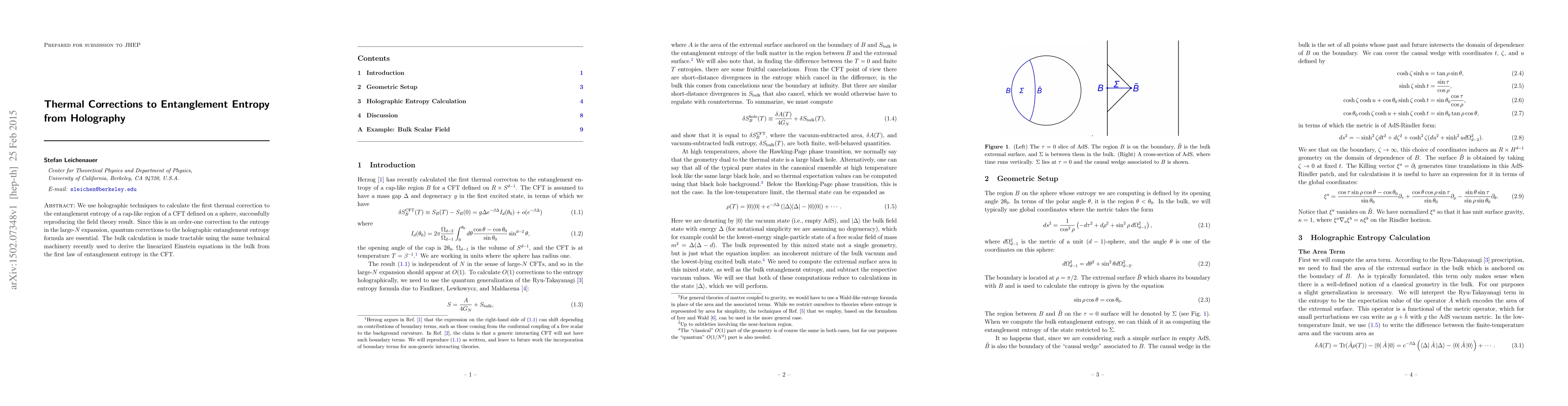This paper calculates the first thermal correction to entanglement entropy in a conformal field theory using holographic techniques, confirming the importance of quantum corrections in the large-N expansion. The method employs the same technical tools used to derive linearized Einstein equations from the first law of entanglement entropy.