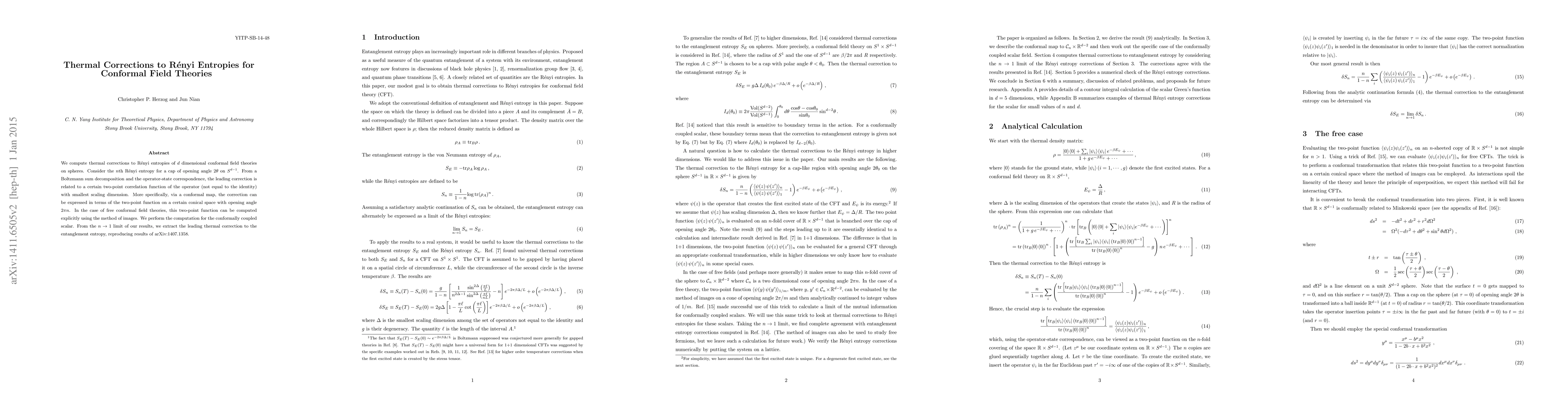 This research paper computes thermal corrections to Renyi entropies in conformal field theories on spheres, providing a new method for calculating entanglement entropy. The results reproduce previous findings and offer insights into the behavior of conformal systems under thermal fluctuations.