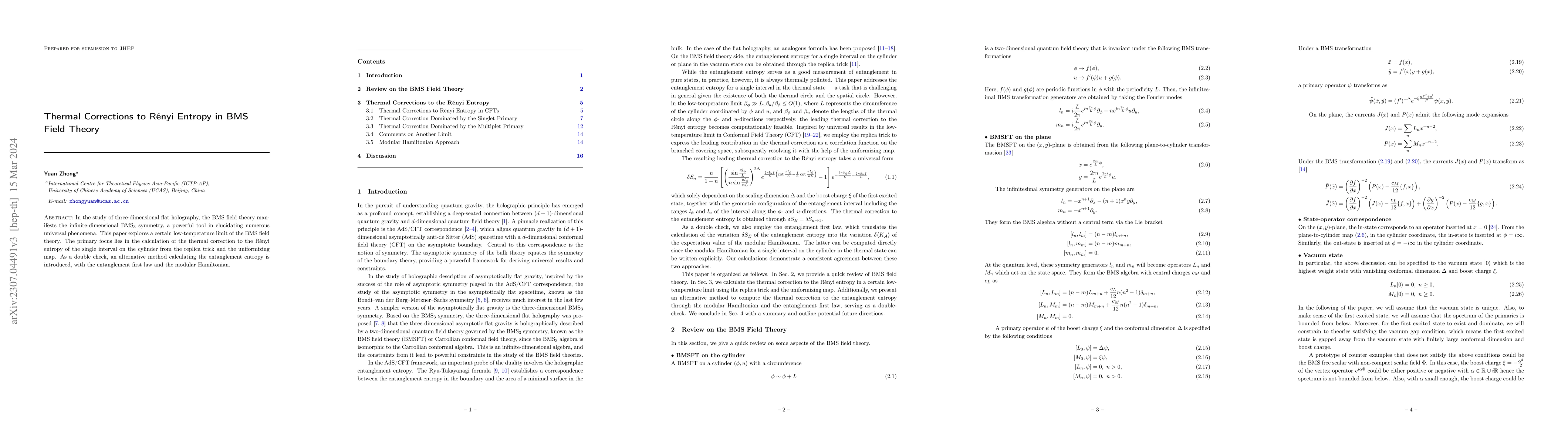 This paper investigates the thermal correction to R\'enyi entropy in BMS field theory, utilizing the replica trick and uniformizing map in a low-temperature limit of three-dimensional flat holography. It also verifies results through an alternative calculation of entanglement entropy using the entanglement first law and modular Hamiltonian.
