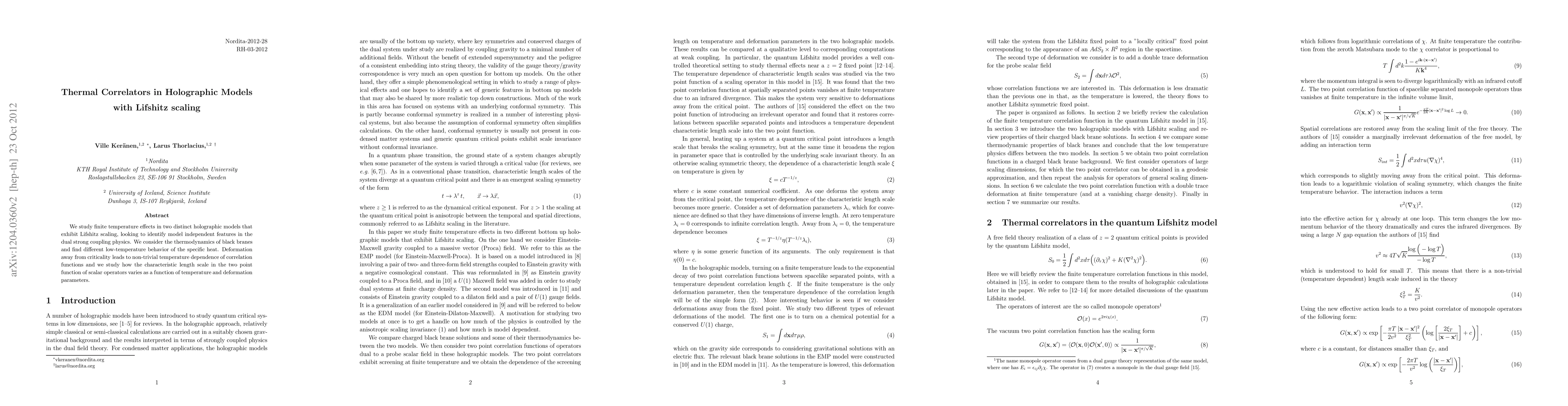 We study finite temperature effects in two distinct holographic models that exhibit Lifshitz scaling, looking to identify model independent features in the dual strong coupling physics. We consider the thermodynamics of black branes and find different low-temperature behavior of the specific heat. Deformation away from criticality leads to non-trivial temperature dependence of correlation functions and we study how the characteristic length scale in the two point function of scalar operators varies as a function of temperature and deformation parameters.