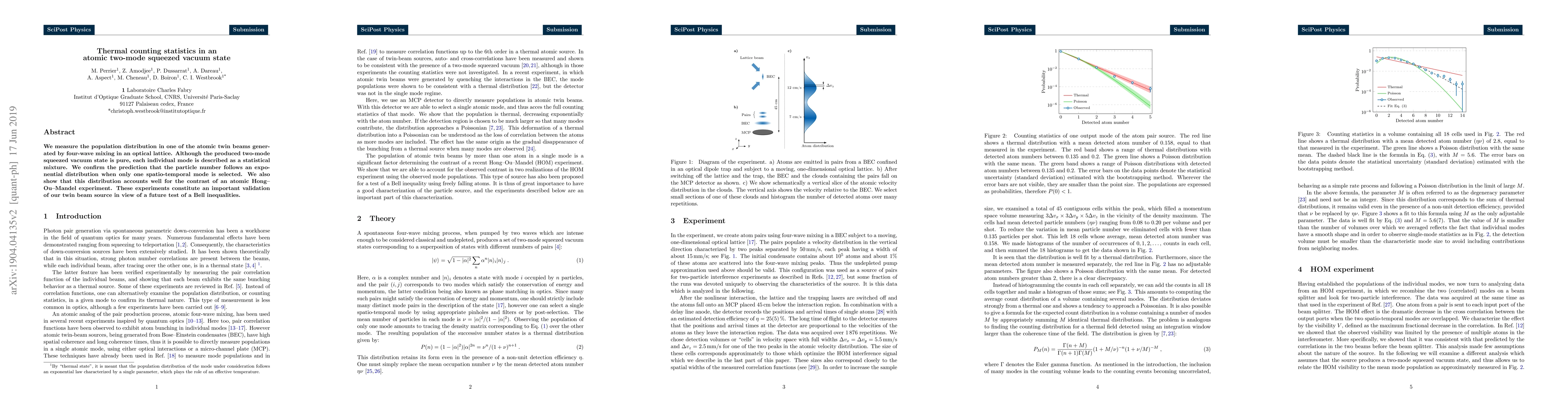 We measure the population distribution in one of the atomic twin beams generated by four-wave mixing in an optical lattice. Although the produced two-mode squeezed vacuum state is pure, each individual mode is described as a statistical mixture. We confirm the prediction that the particle number follows an exponential distribution when only one spatio-temporal mode is selected. We also show that this distribution accounts well for the contrast of an atomic Hong--Ou--Mandel experiment. These experiments constitute an important validation of our twin beam source in view of a future test of a Bell inequalities.