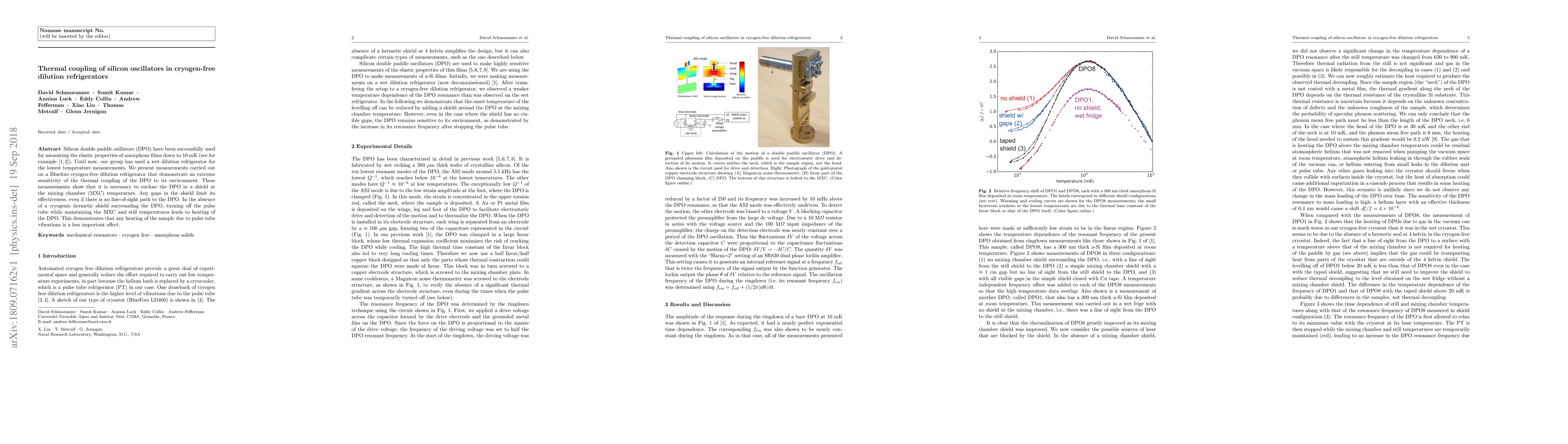 Silicon double paddle osillators (DPO) have been successfully used for measuring the elastic properties of amorphous films down to 10 mK (see for example \cite{Fefferman16,Liu14}). Until now, our group has used a wet dilution refrigerator for the lowest temperature measurements. We present measurements carried out on a Bluefors cryogen-free dilution refrigerator that demonstrate an extreme sensitivity of the thermal coupling of the DPO to its environment. These measurements show that it is necessary to enclose the DPO in a shield at the mixing chamber (MXC) temperature. Any gaps in the shield limit its effectiveness, even if there is no line-of-sight path to the DPO. In the absence of a cryogenic hermetic shield surrounding the DPO, turning off the pulse tube while maintaining the MXC and still temperatures leads to heating of the DPO. This demonstrates that any heating of the sample due to pulse tube vibrations is a less important effect.