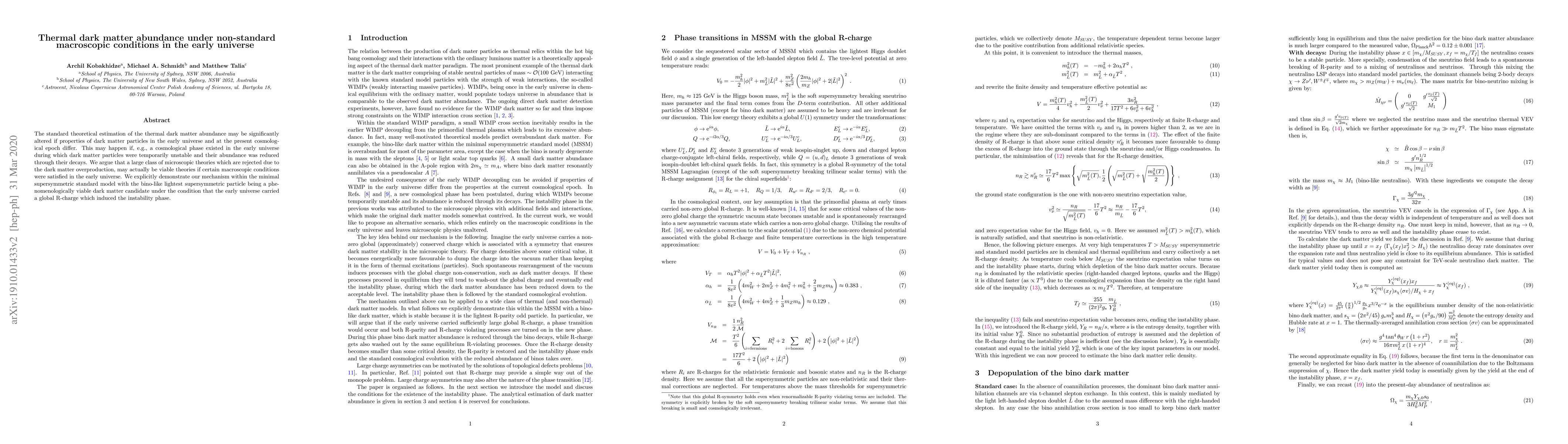 This paper explores how non-standard macroscopic conditions in the early universe, such as a temporary instability phase for dark matter particles, can alter the standard estimation of thermal dark matter abundance. It demonstrates that certain microscopic theories previously rejected due to overproduction of dark matter may be viable under these conditions, using the minimal supersymmetric standard model with a bino-like lightest supersymmetric particle as an example.