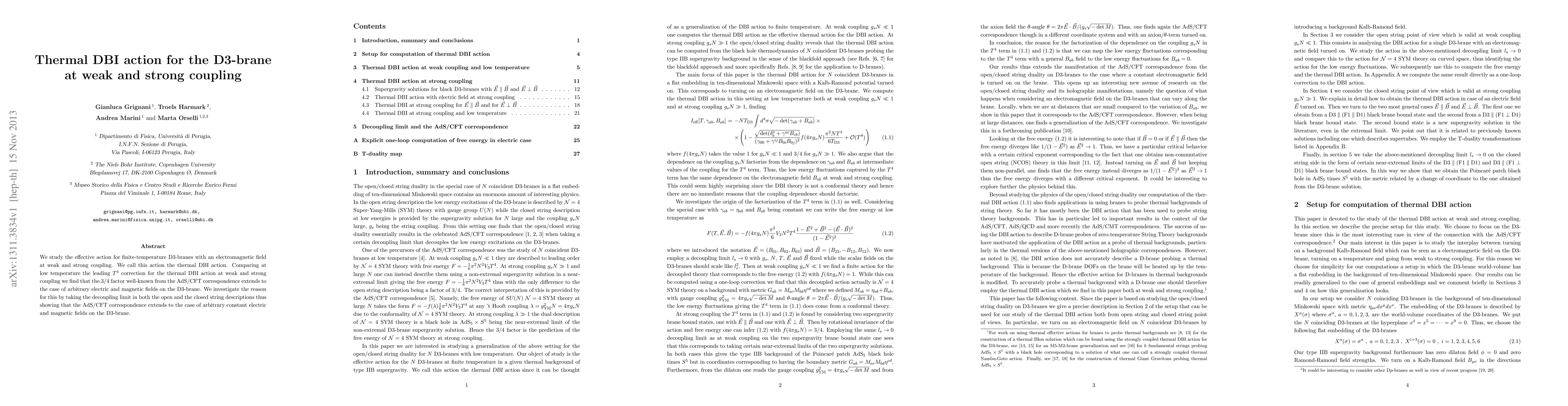 We study the effective action for finite-temperature D3-branes with an electromagnetic field at weak and strong coupling. We call this action the thermal DBI action. Comparing at low temperature the leading $T^4$ correction for the thermal DBI action at weak and strong coupling we find that the $3/4$ factor well-known from the AdS/CFT correspondence extends to the case of arbitrary electric and magnetic fields on the D3-brane. We investigate the reason for this by taking the decoupling limit in both the open and the closed string descriptions thus showing that the AdS/CFT correspondence extends to the case of arbitrary constant electric and magnetic fields on the D3-brane.