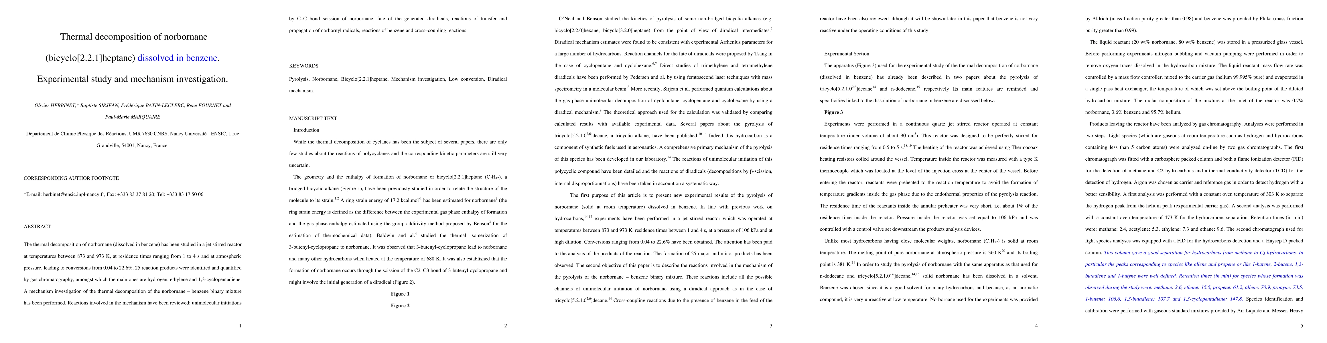 The thermal decomposition of norbornane (dissolved in benzene) has been studied in a jet stirred reactor at temperatures between 873 and 973 K, at residence times ranging from 1 to 4 s and at atmospheric pressure, leading to conversions from 0.04 to 22.6%. 25 reaction products were identified and quantified by gas chromatography, amongst which the main ones are hydrogen, ethylene and 1,3-cyclopentadiene. A mechanism investigation of the thermal decomposition of the norbornane - benzene binary mixture has been performed. Reactions involved in the mechanism have been reviewed: unimolecular initiations 1 by C-C bond scission of norbornane, fate of the generated diradicals, reactions of transfer and propagation of norbornyl radicals, reactions of benzene and cross-coupling reactions.