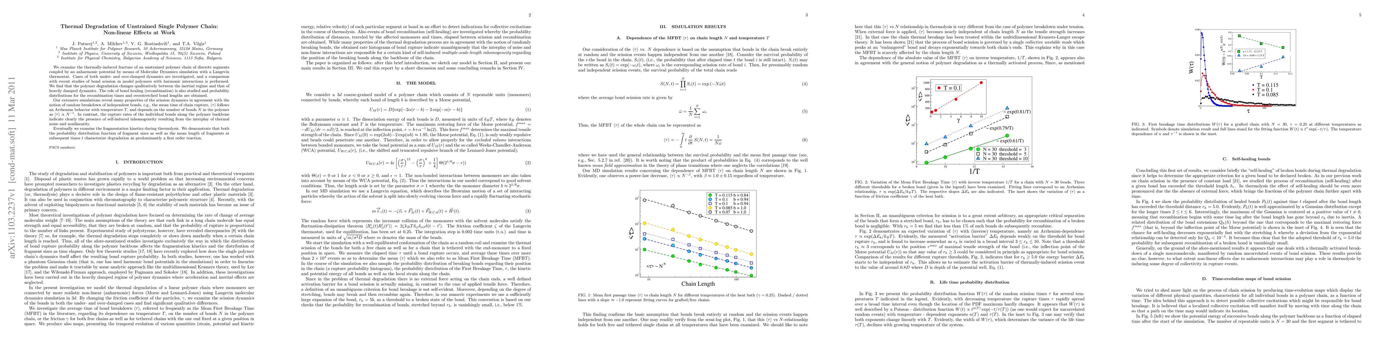 We examine the thermally-induced fracture of an unstrained polymer chain of discrete segments coupled by an anharmonic potential by means of Molecular Dynamics simulation with a Langevin thermostat. Cases of both under- and over-damped dynamics are investigated, and a comparison with recent studies of bond scission in model polymers with harmonic interactions is performed. We find that the polymer degradation changes qualitatively between the inertial regime and that of heavily damped dynamics. The role of bond healing (recombination) is also studied and probability distributions for the recombination times and overstretched bond lengths are obtained. Our extensive simulations reveal many properties of the scission dynamics in agreement with the notion of random breakdown of independent bonds, e.g., the mean time of chain rupture, $<\tau>$ follows an Arrhenian behavior with temperature $T$, and depends on the number of bonds $N$ in the polymer as $<\tau> \propto N^{-1}$. In contrast, the rupture rates of the individual bonds along the polymer backbone indicate clearly the presence of self-induced inhomogeneity resulting from the interplay of thermal noise and nonlinearity. Eventually we examine the fragmentation kinetics during thermolysis. We demonstrate that both the probability distribution function of fragment sizes as well as the mean length of fragments at subsequent times $t$ characterize degradation as predominantly a first order reaction.