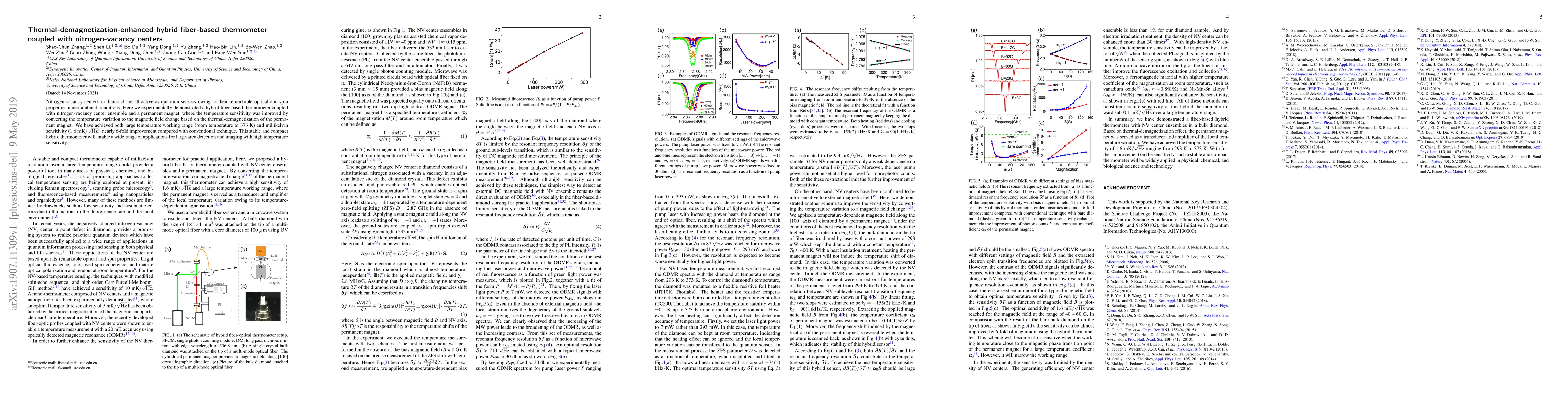 This paper presents a hybrid fiber-based thermometer enhanced by thermal-demagnetization of a permanent magnet, coupled with nitrogen-vacancy centers in diamond for improved temperature sensitivity. The method achieves a large temperature range and millikelvin sensitivity, offering significant improvements for large-area detection and imaging applications.