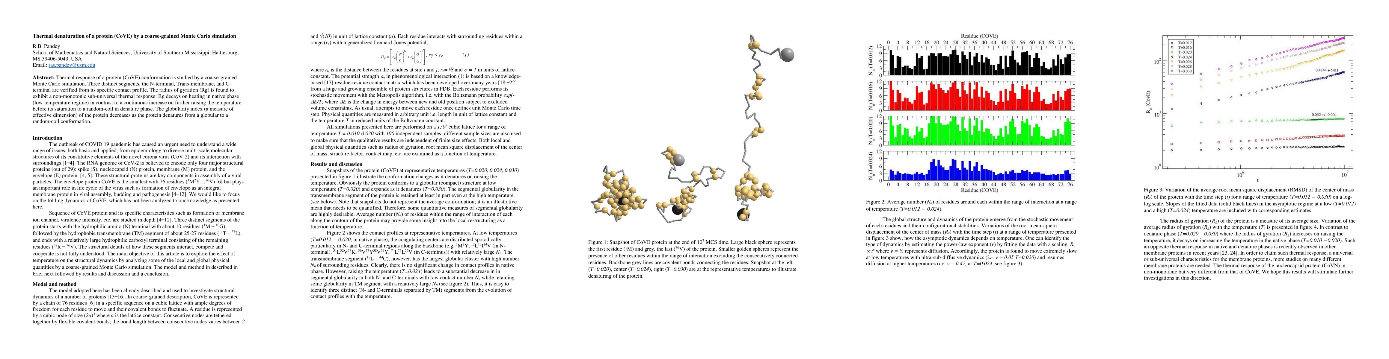 This study investigates the thermal denaturation of protein COVE using coarse-grained Monte Carlo simulations, revealing a non-monotonic radius of gyration response and a decrease in globularity index as the protein transitions from a globular to a random-coil conformation.