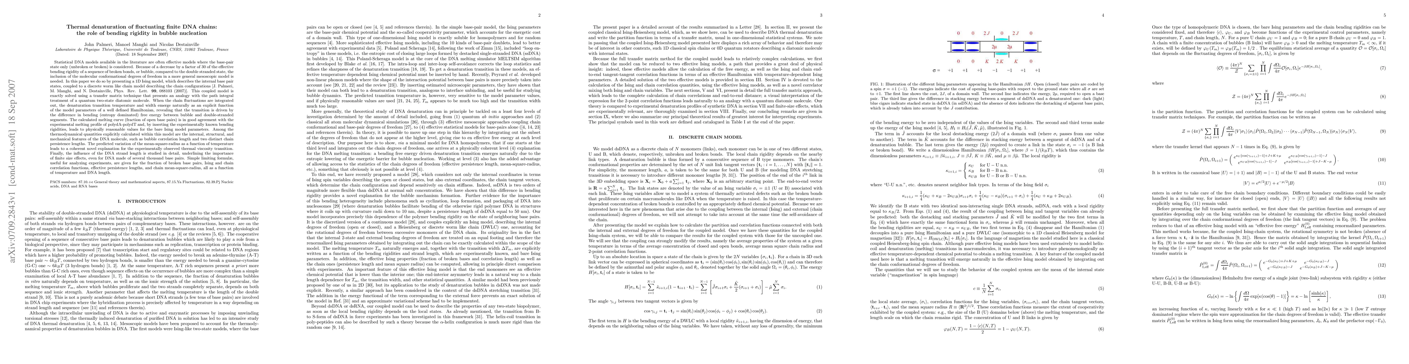 This paper presents a 1D Ising model coupled with a discrete worm-like chain model to describe the thermal denaturation of fluctuating finite DNA chains, emphasizing the role of bending rigidity in bubble nucleation. The model reveals that the denaturation transition is driven by differences in bending free energy between bubble and double-stranded segments, providing a coherent explanation for the observed thermal viscosity transition.