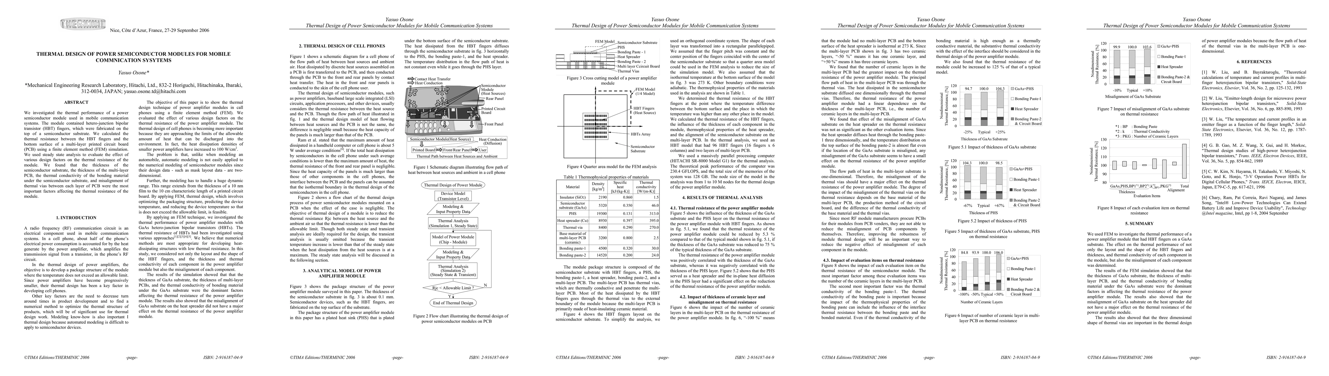 The research calculates thermal resistance in power semiconductor modules for mobile communication, using FEM. Key parameters influencing thermal resistance are GaAs substrate thickness, multi-layer PCB thickness, bonding material thermal conductivity, and thermal via misalignment.