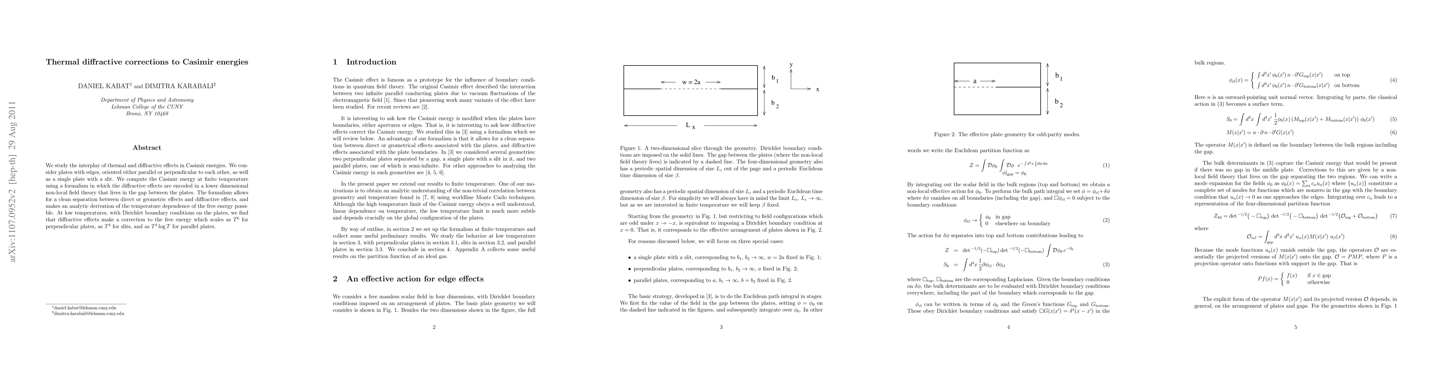 This paper investigates thermal and diffractive influences on Casimir energies between plates with edges, revealing corrections scaling as T^6 for perpendicular plates, T^4 for slits, and T^4 log T for parallel plates at low temperatures. The study employs a non-local field theory to separate direct and diffractive effects analytically.