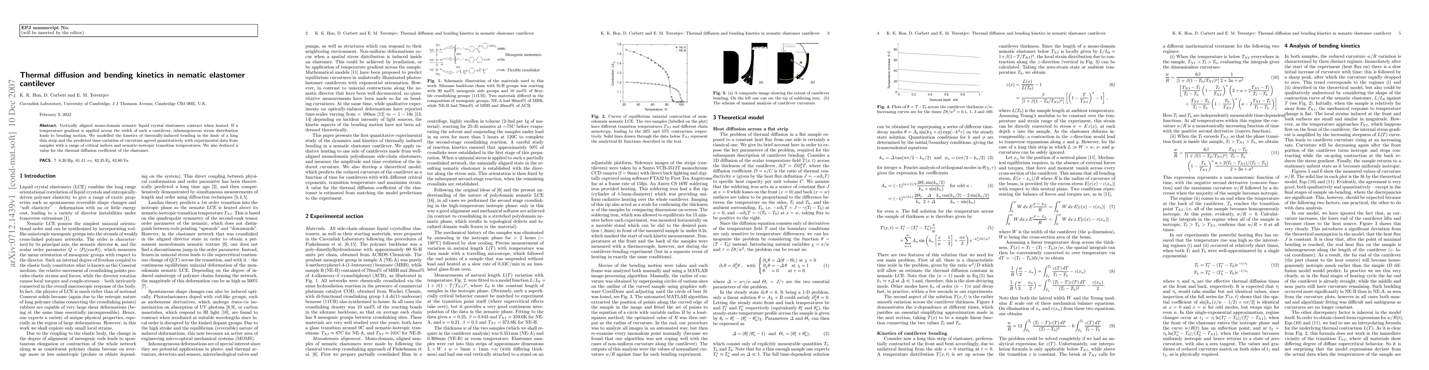 This paper models the thermally-induced bending kinetics in nematic elastomer cantilevers, showing agreement between predicted curvature time-variation and experimental data. The study also determines the thermal diffusion coefficient of the elastomer.
